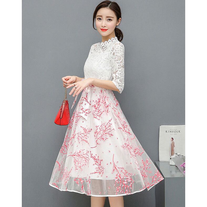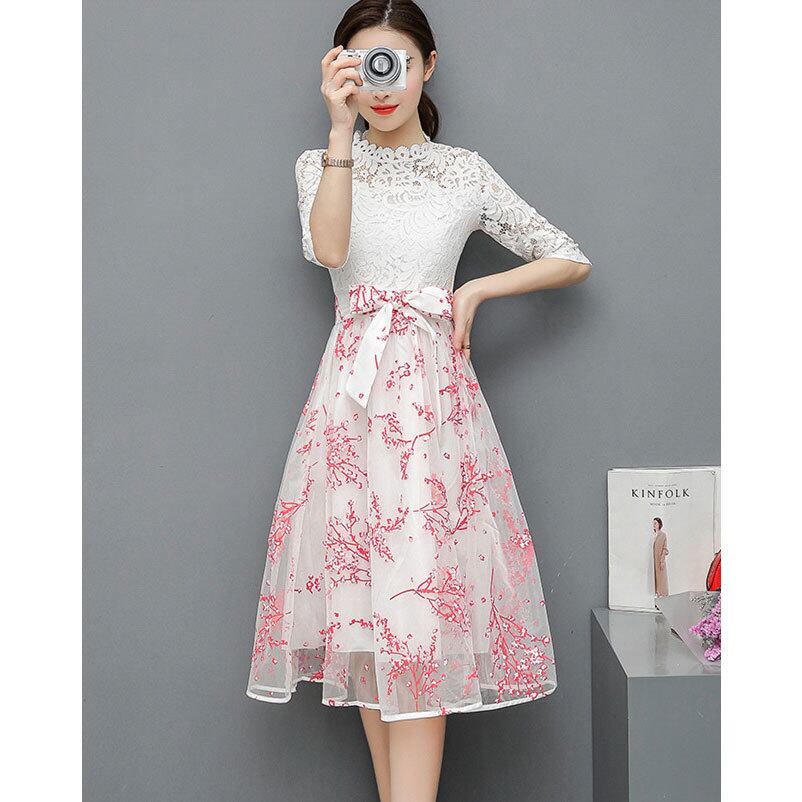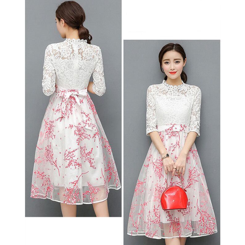 ☆SALE☆ ★白レーストップ♪華やかフローラル柄ミディドレス★