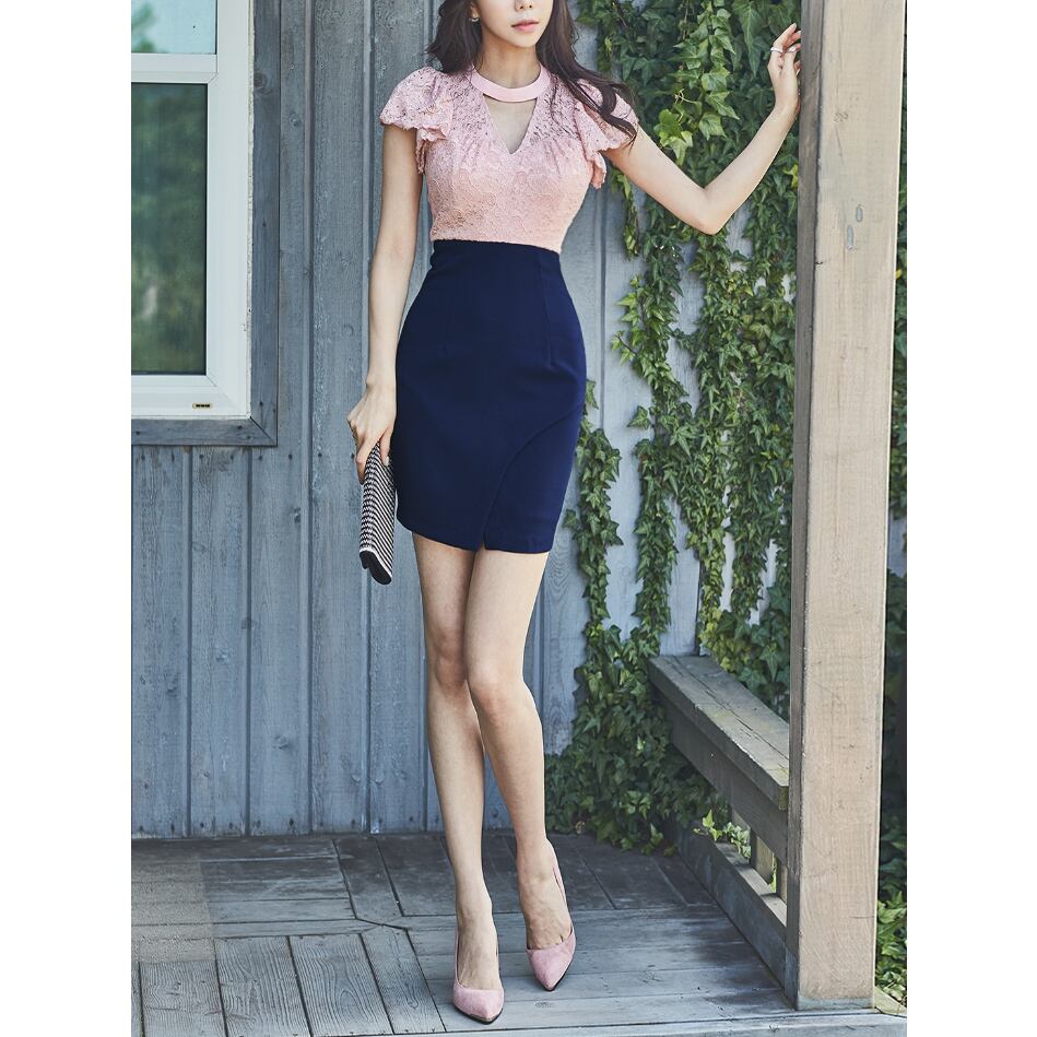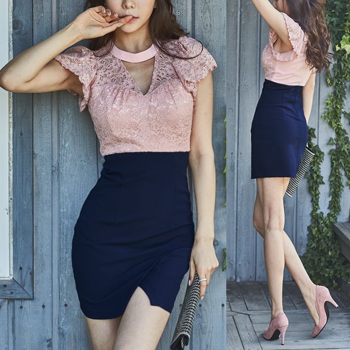 ☆SALE☆ フェミニン★Vカットレース配色パーティーワンピースdkk61