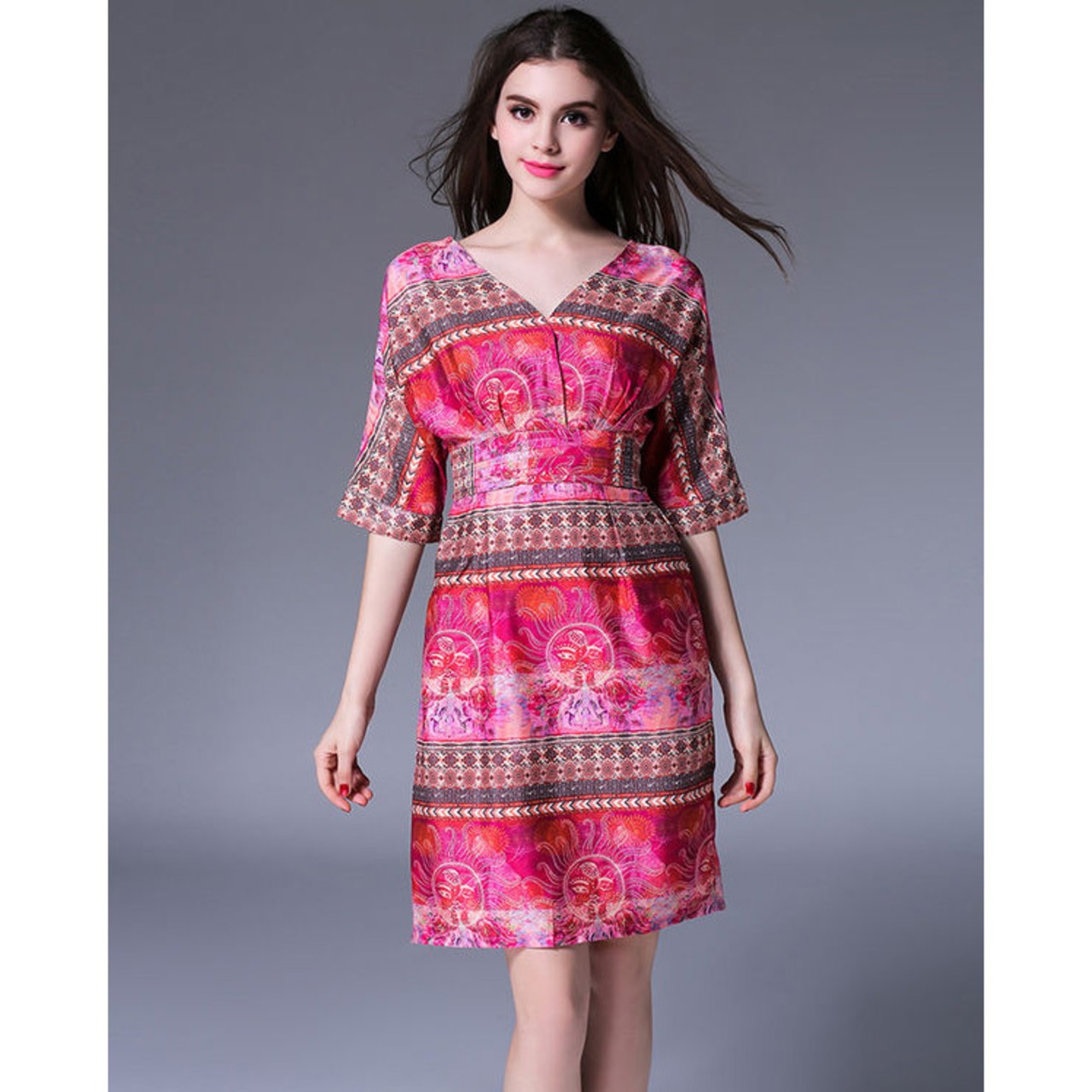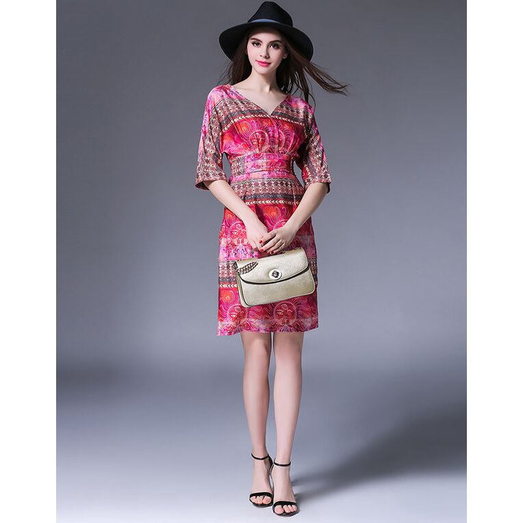 ☆SALE☆ ★あでやか色エキゾチック柄♪Vネック七分袖ワンピース★