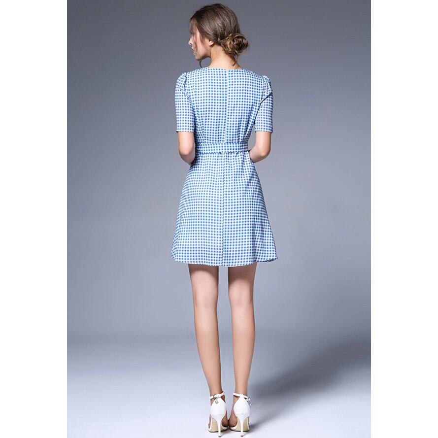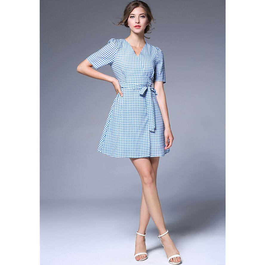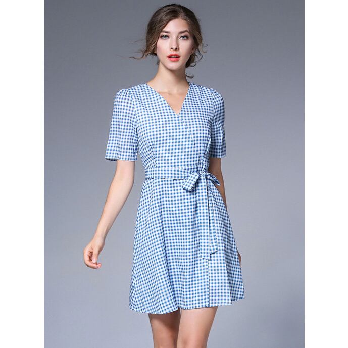 ☆SALE☆ ★ギンガムチェック柄♪Vネック&ウエストリボンAラインワンピ★