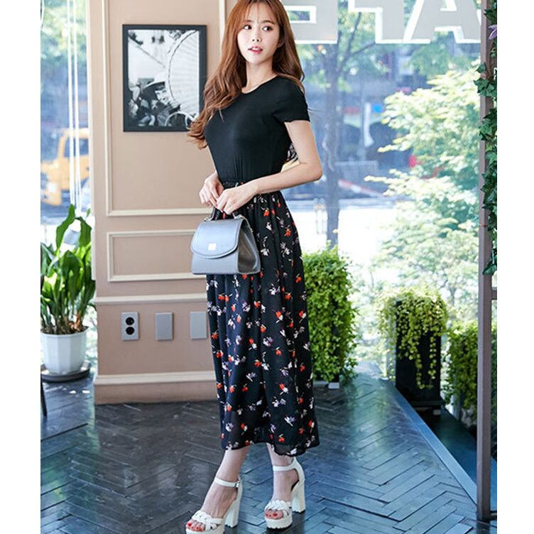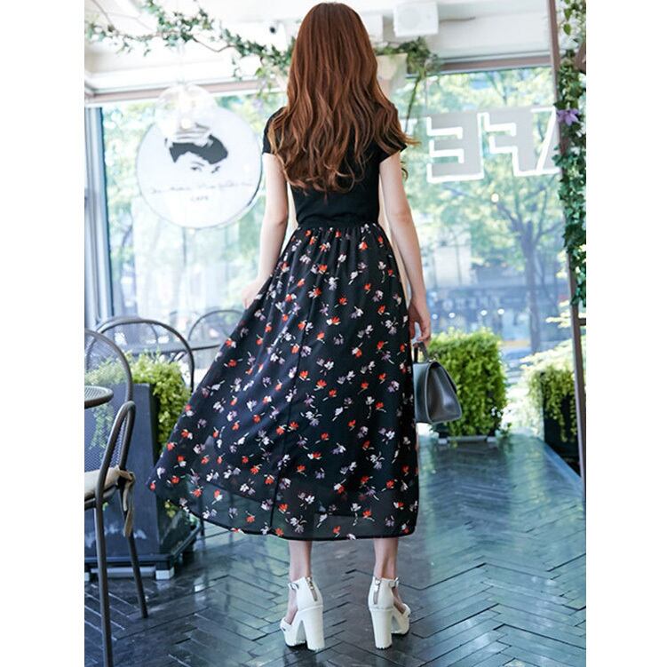 ☆SALE☆ ★スキニー黒トップ♪小花柄プリントフレアーロングワンピース★