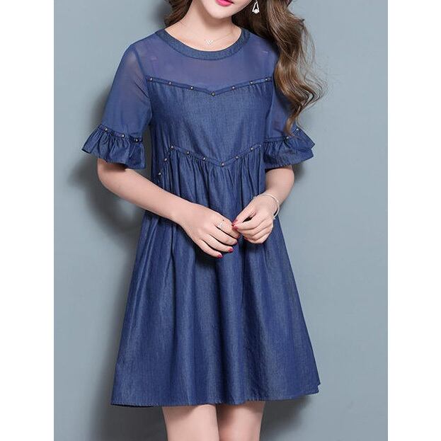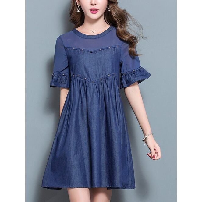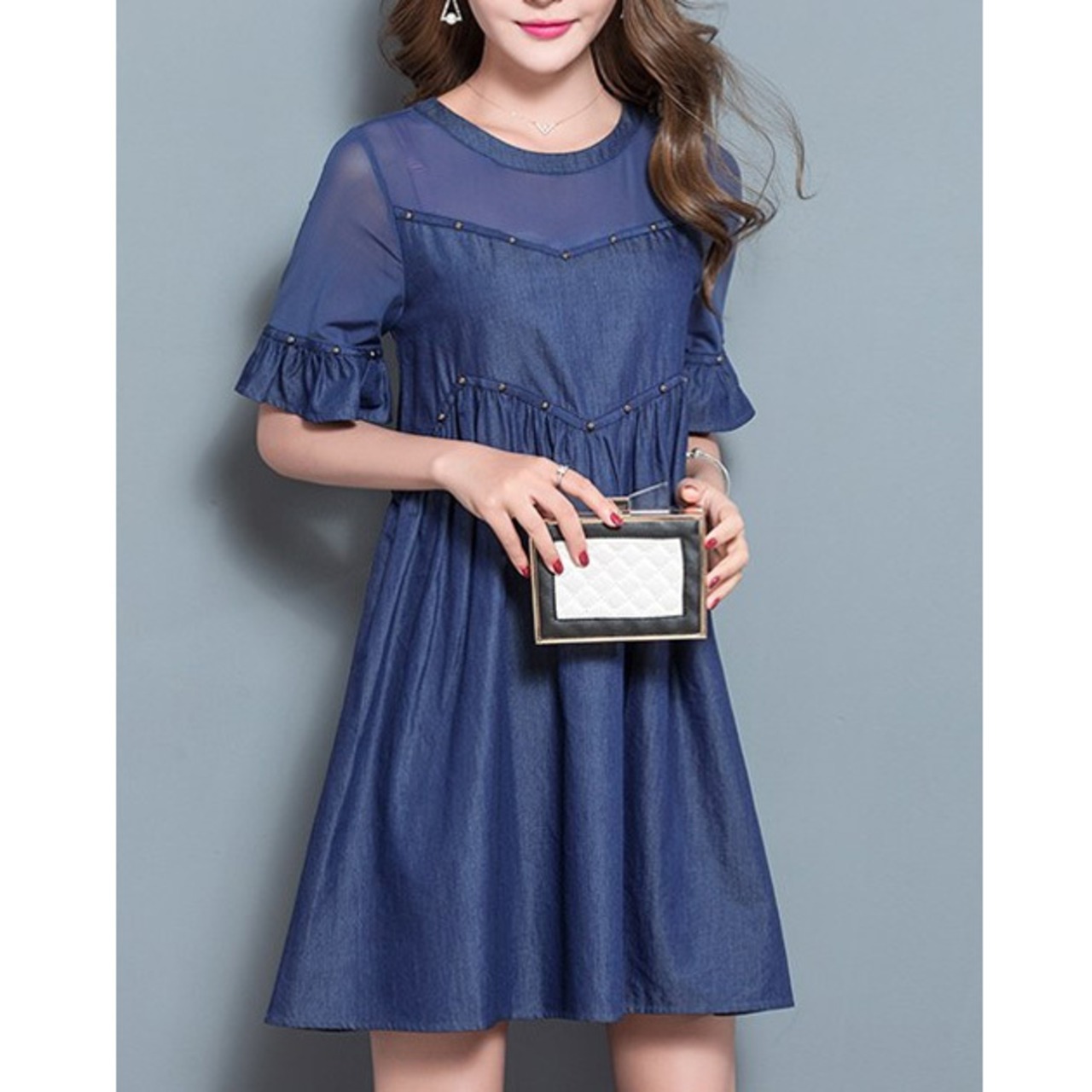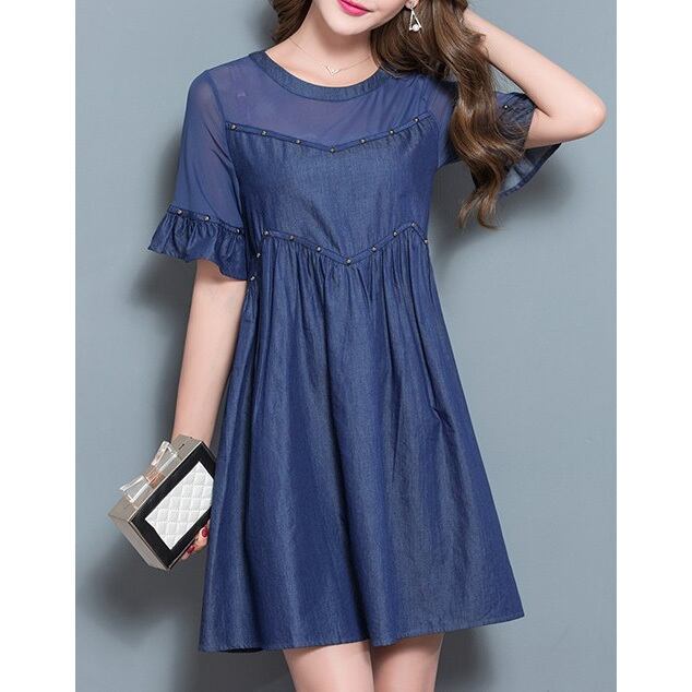 ☆SALE☆ ★スタッズ風トリム♪透けショルダーデニムミニワンピース★