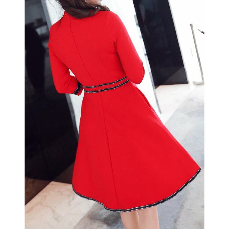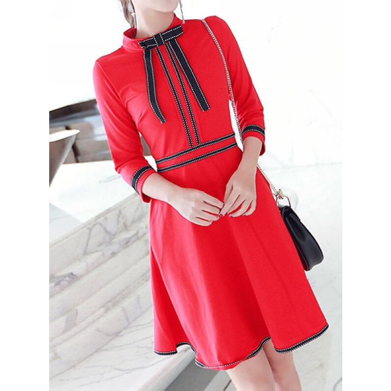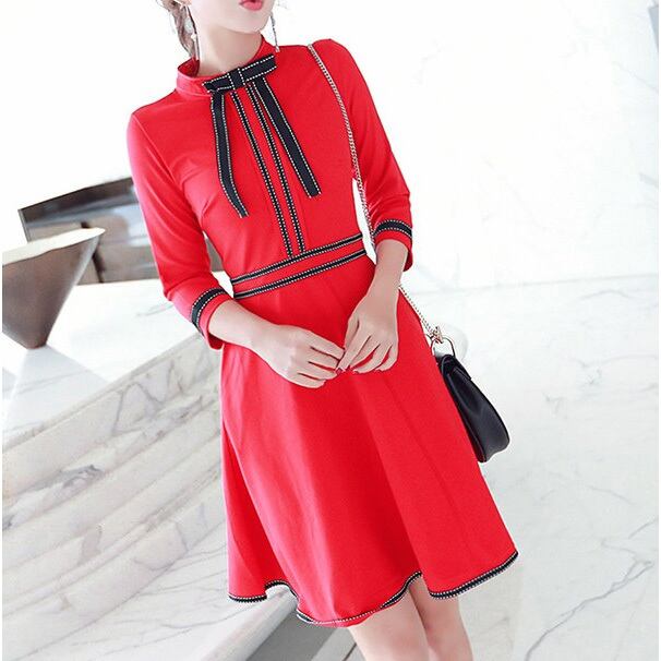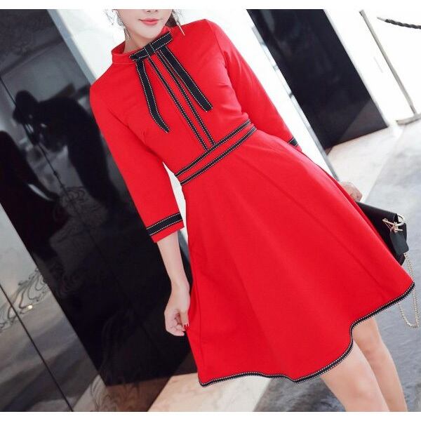 ☆SALE☆ ★ステッチリボントリム♪七分袖フレアワンピース全2色★