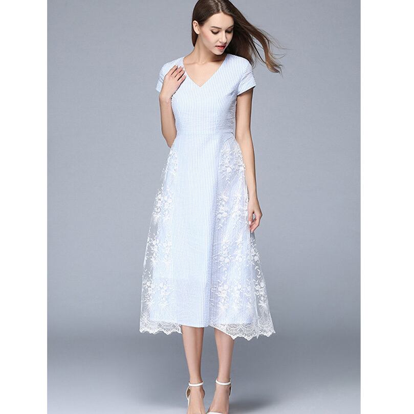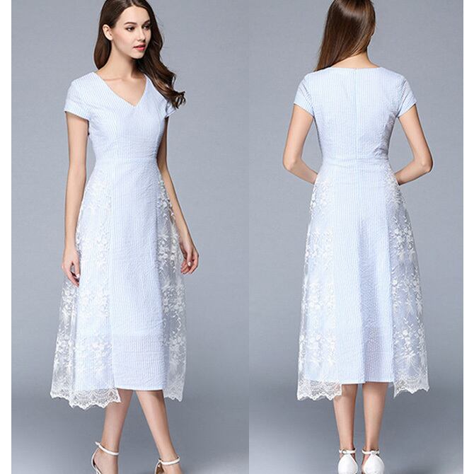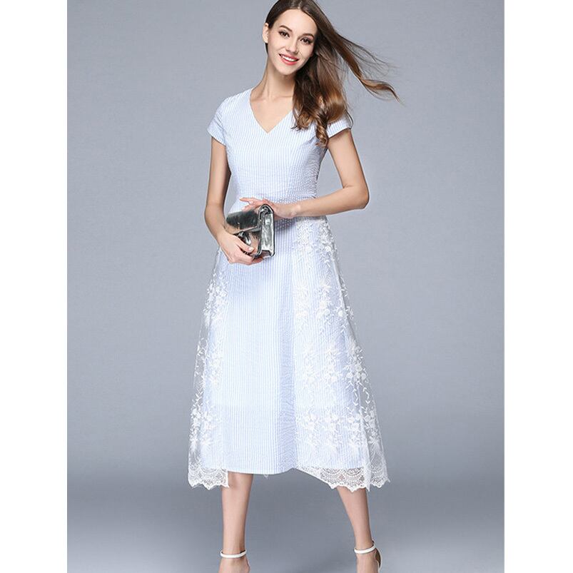 ☆SALE☆ ★ストライプ×ホワイト花レース♪美シルエットVネックドレス★