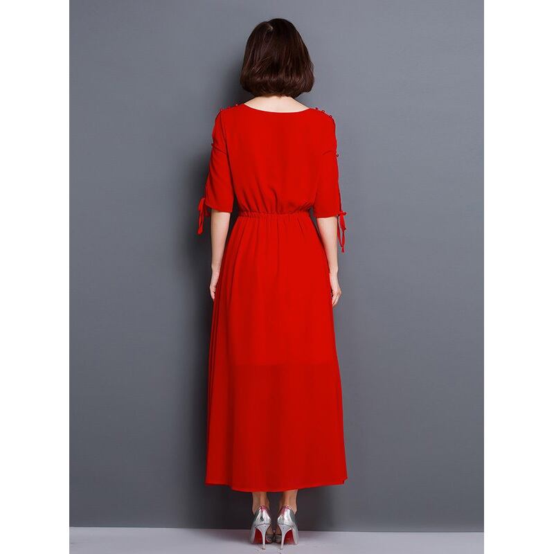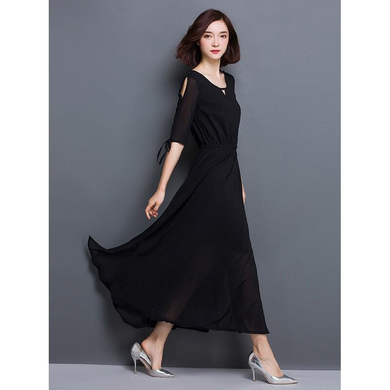☆SALE☆ ★スリット&細リボンスリーブ♪ロングシフォンワンピ全2色★