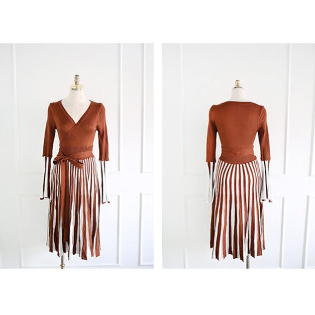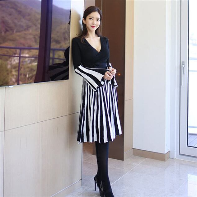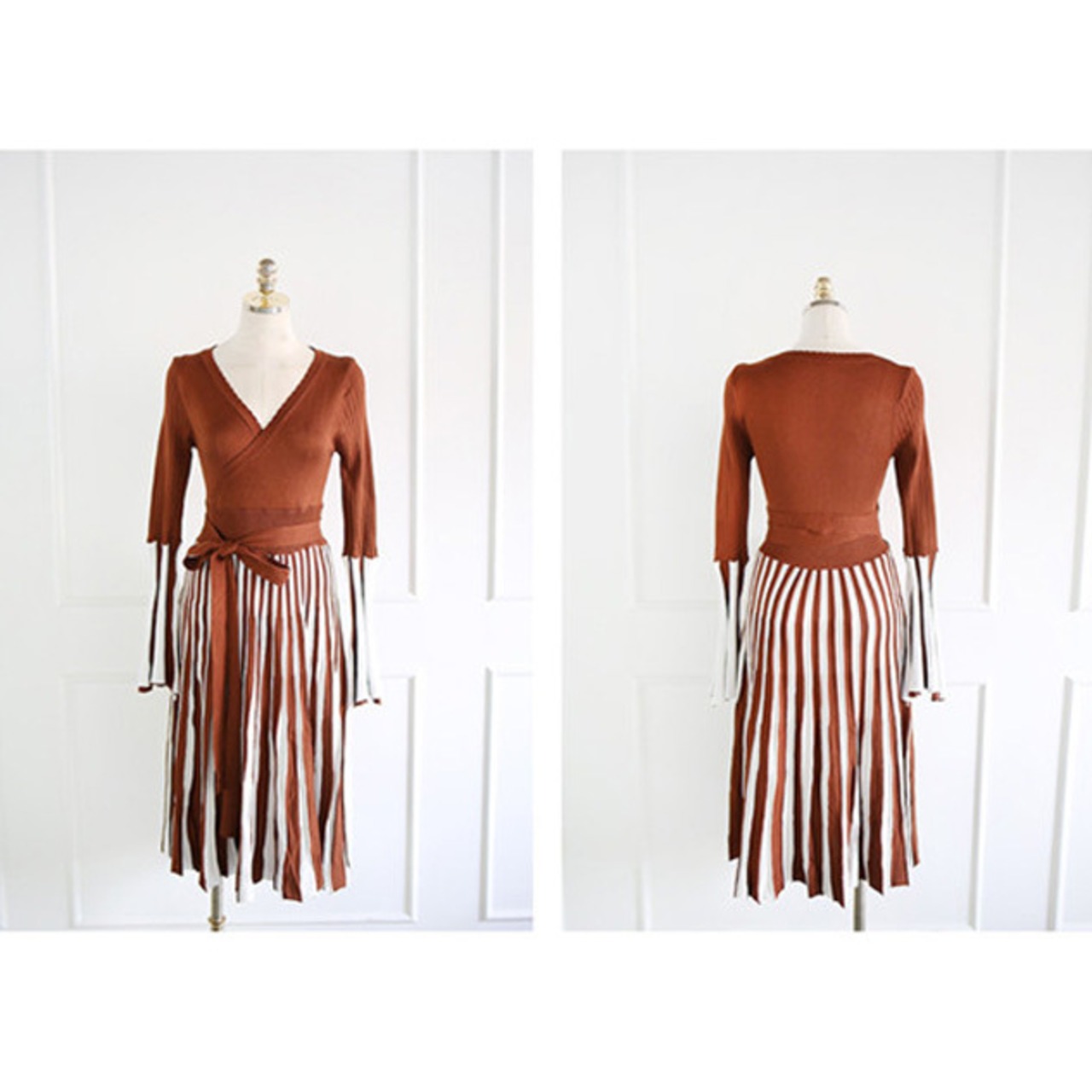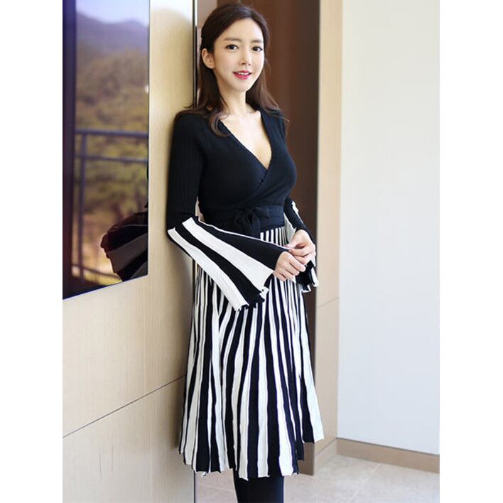 ☆SALE☆ ★セクシーVネック♪ストライプ切替フレア袖ワンピース全2色★
