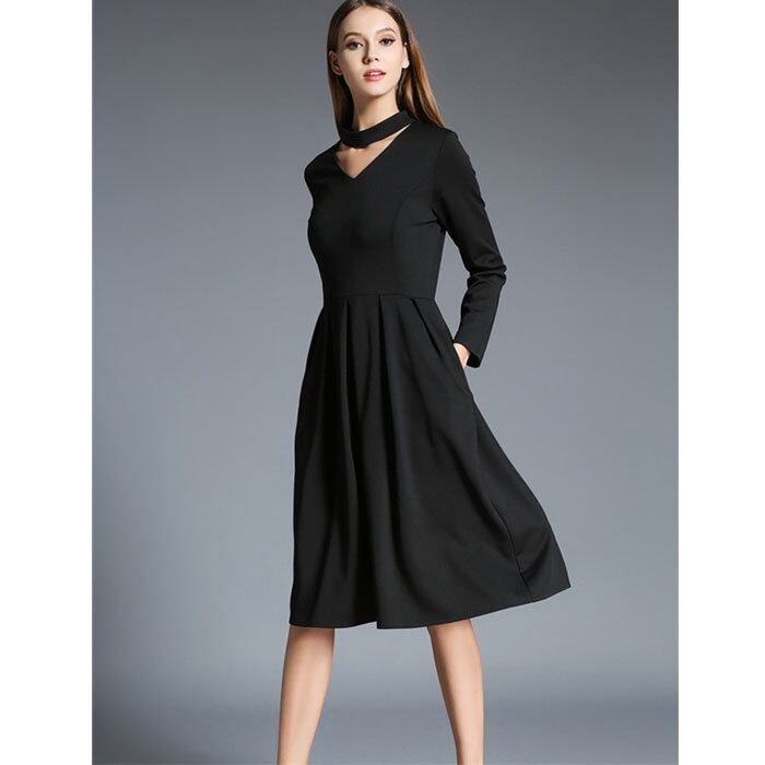 ☆SALE☆ ★チョーカー風ネック♪Vネック黒ミディワンピース★