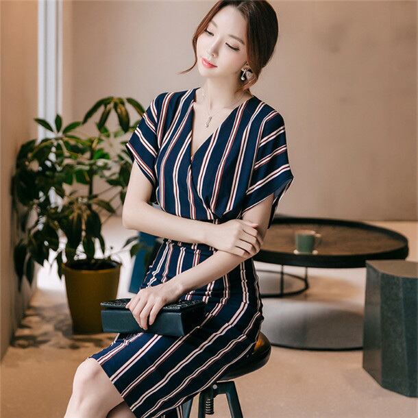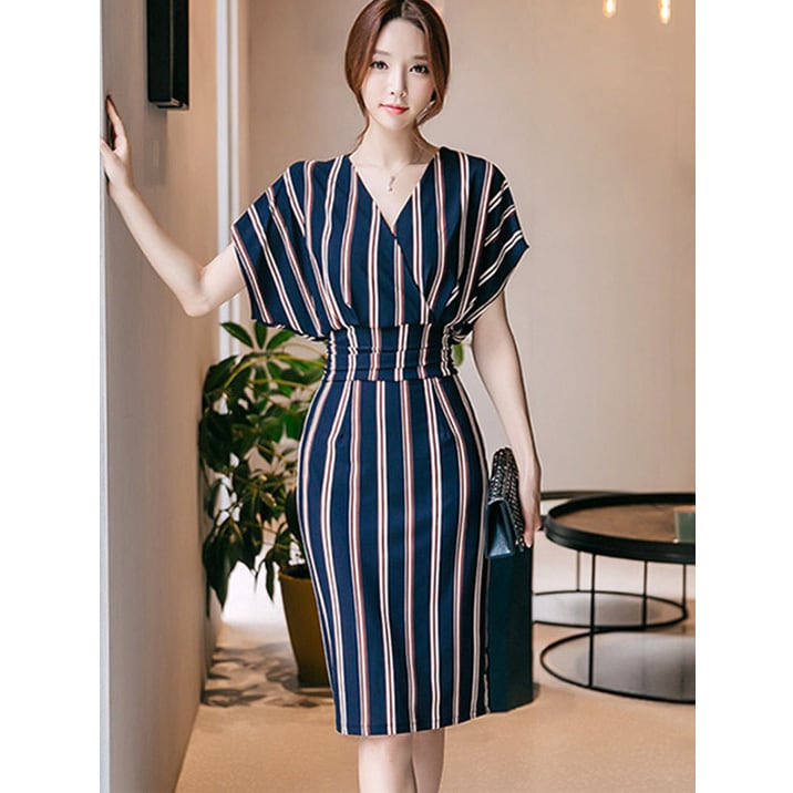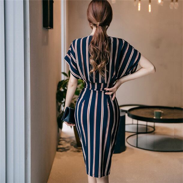 ☆SALE☆ ★ドルマンスリーブ♪ストライプ柄ウエスト切替ペンシルワンピ★