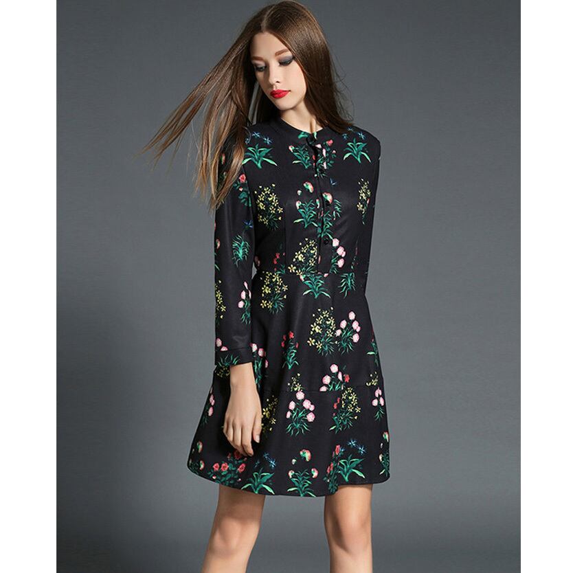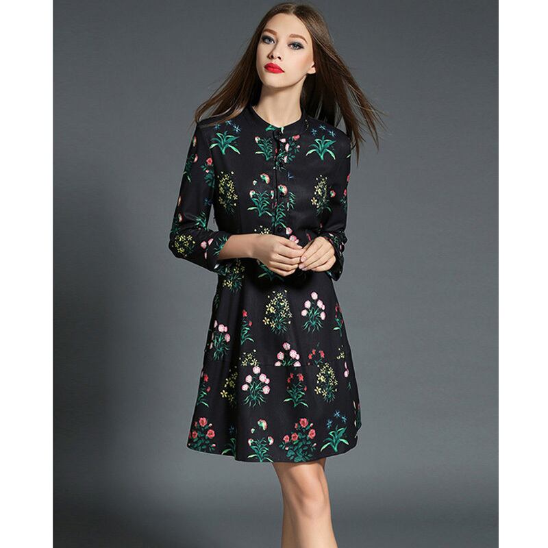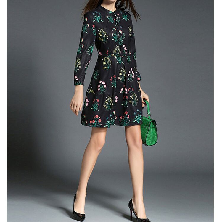 ☆SALE☆ ★ナチュラルフローラル柄♪バンドカラーAライン黒ワンピース★