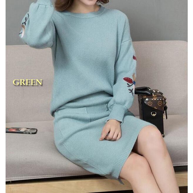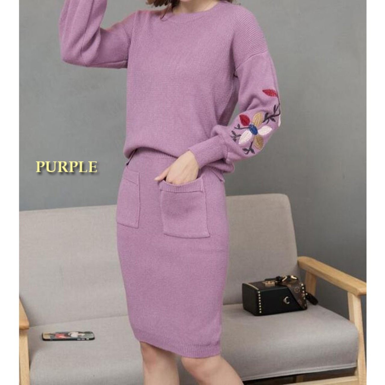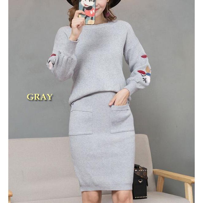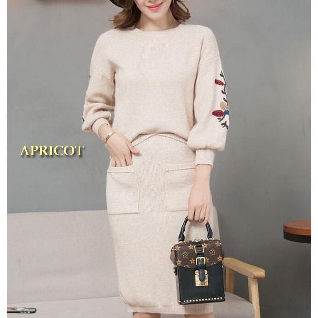 ☆SALE☆ ★ニットセットアップ♪花刺繍スリーブトップ&スカート全6色★