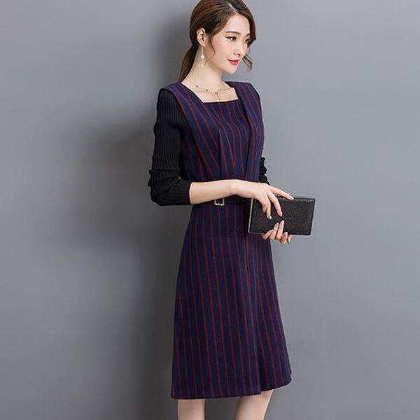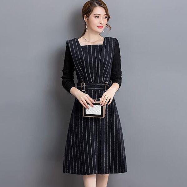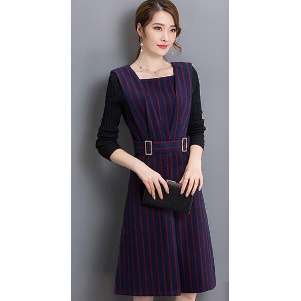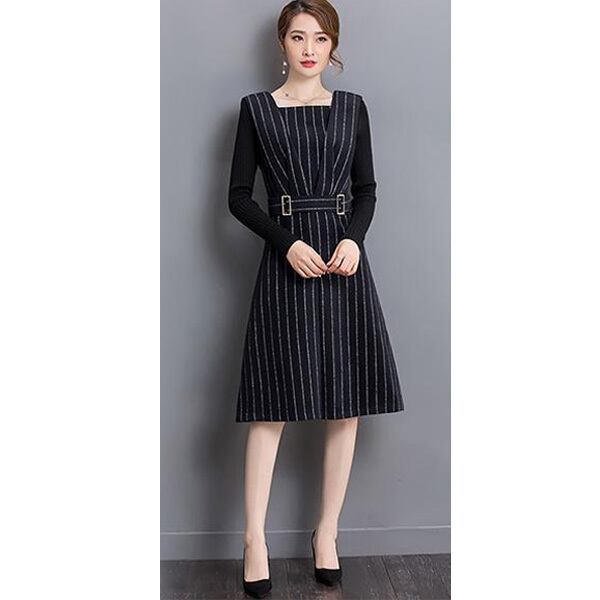 ☆SALE☆ ★ベルト風ウエストマーク♪袖付きストライプ柄ワンピ全2色★