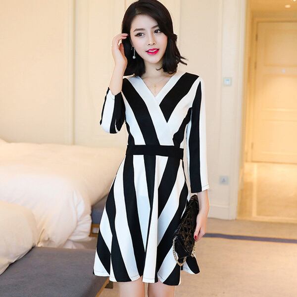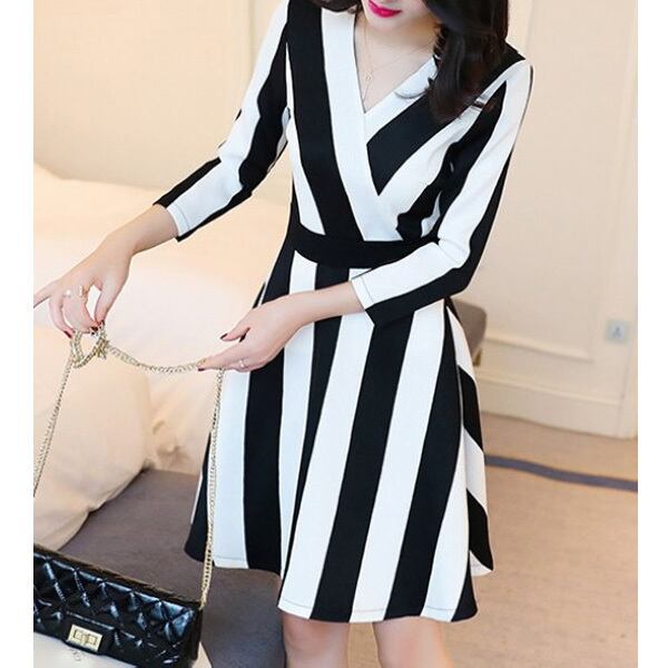 ☆SALE☆ ★モノトーンストライプ柄♪Vネックフレアーワンピース★