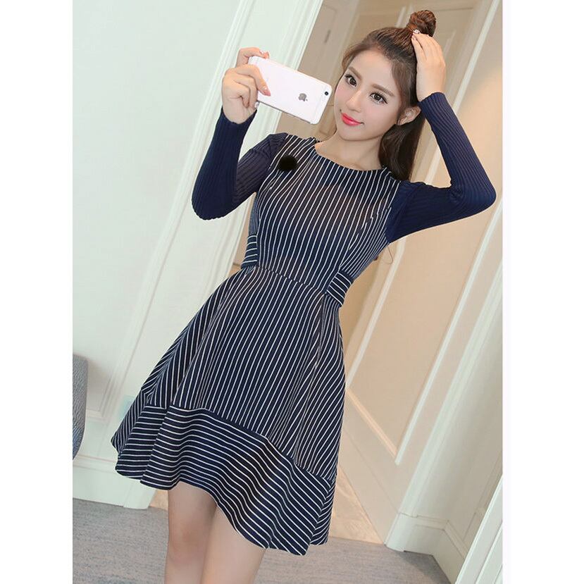 ☆SALE☆ ★リブニットスリーブ♪ストライプ柄コクーンワンピース全2色★