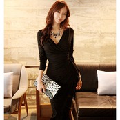 ☆SALE☆ ★ワンサイドフリル&Vネック♪エレガント黒タイトワンピース★