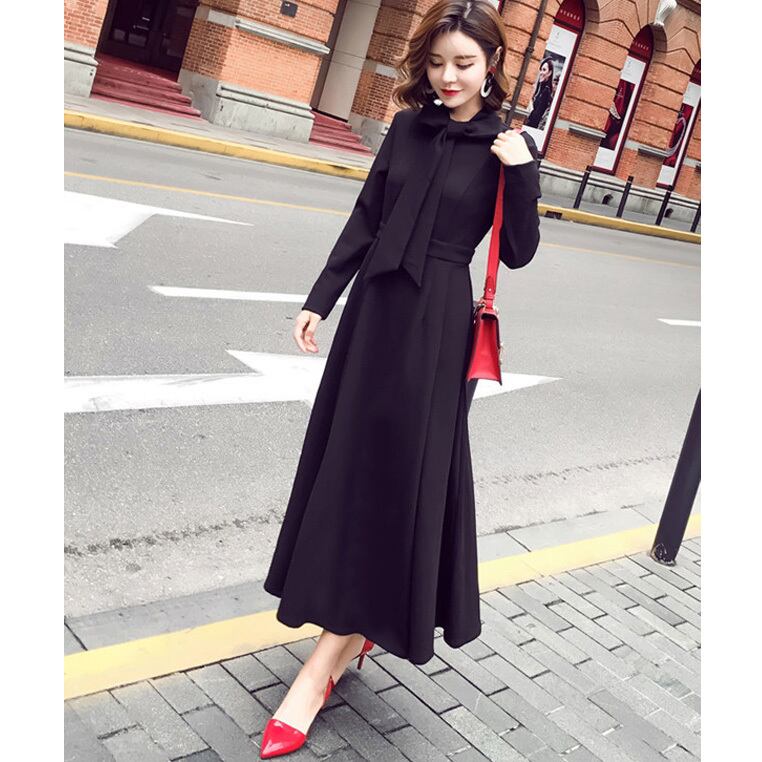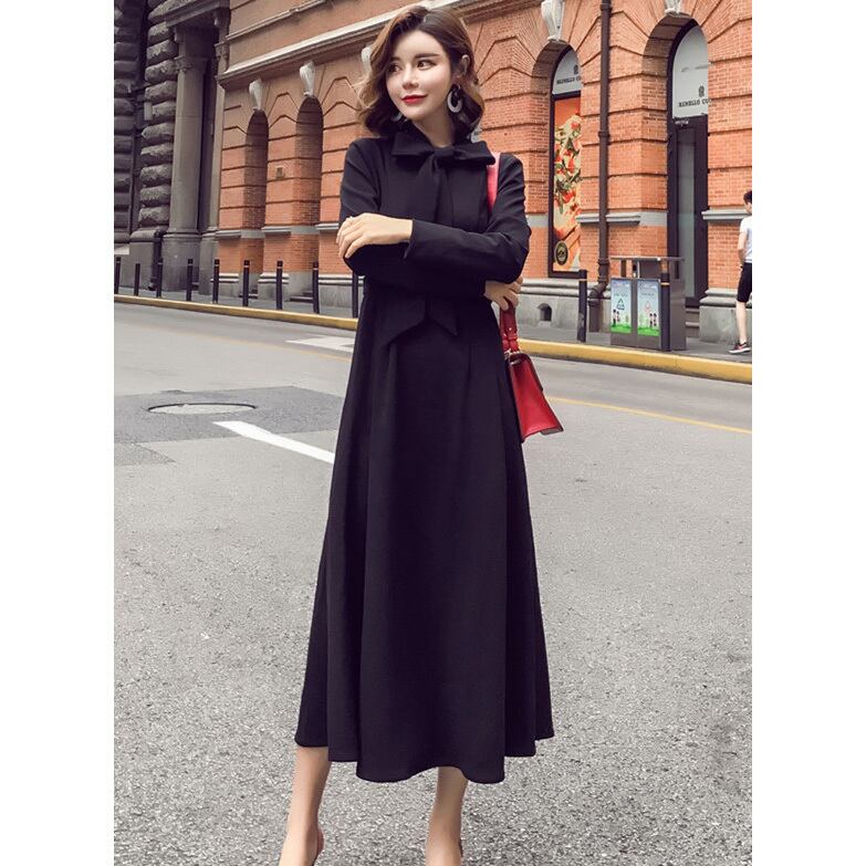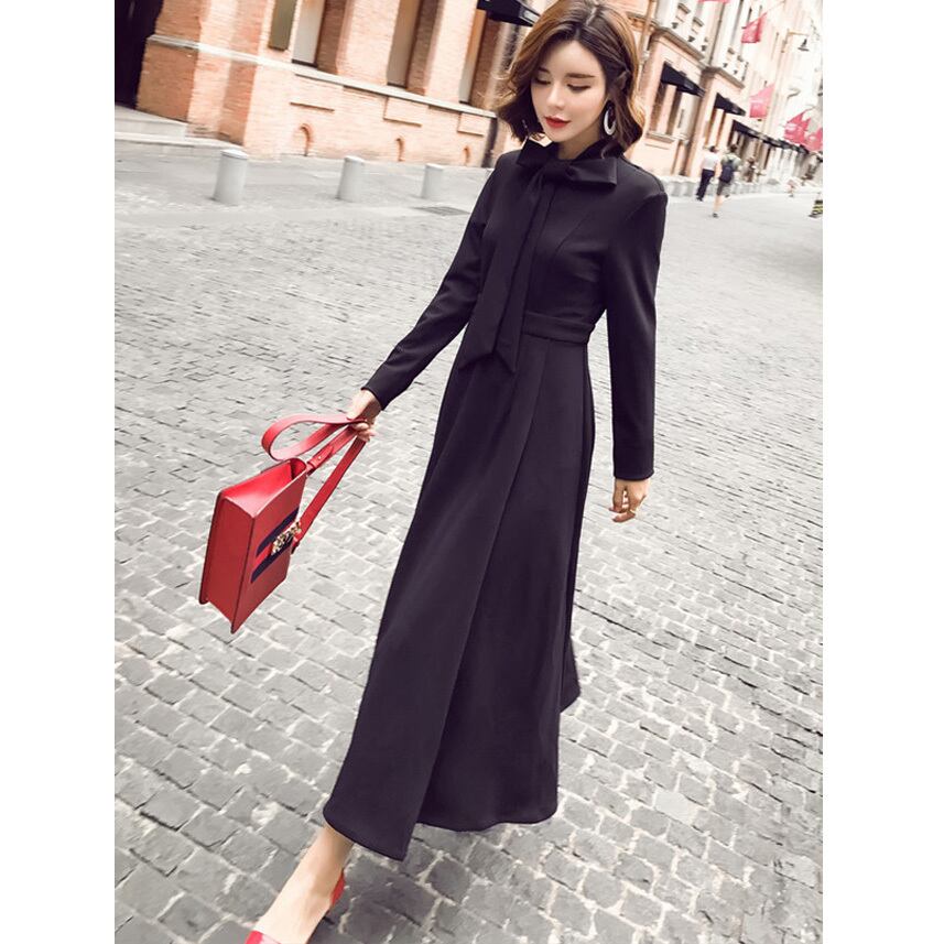 ☆SALE☆ ★上品可愛いネックボウタイ♪ロングフレアー黒ワンピース★