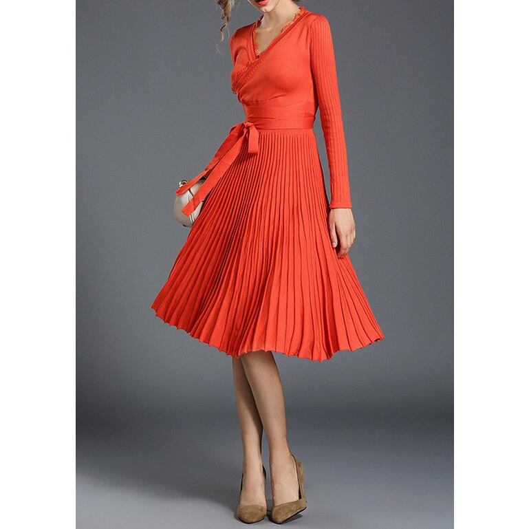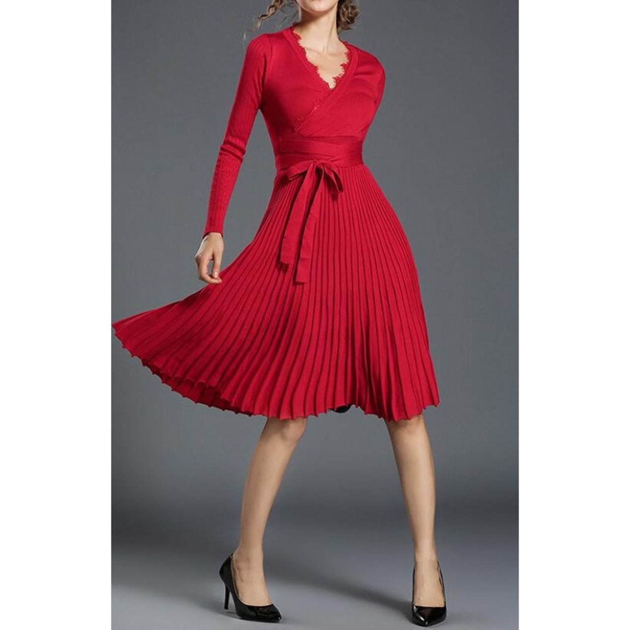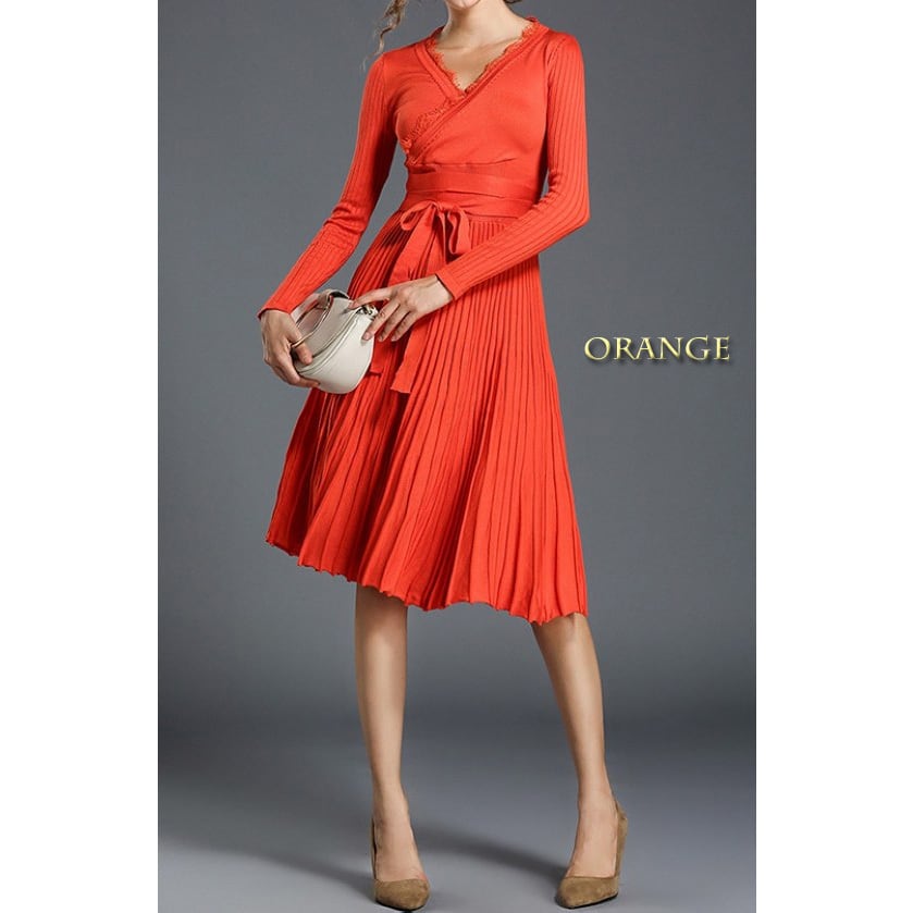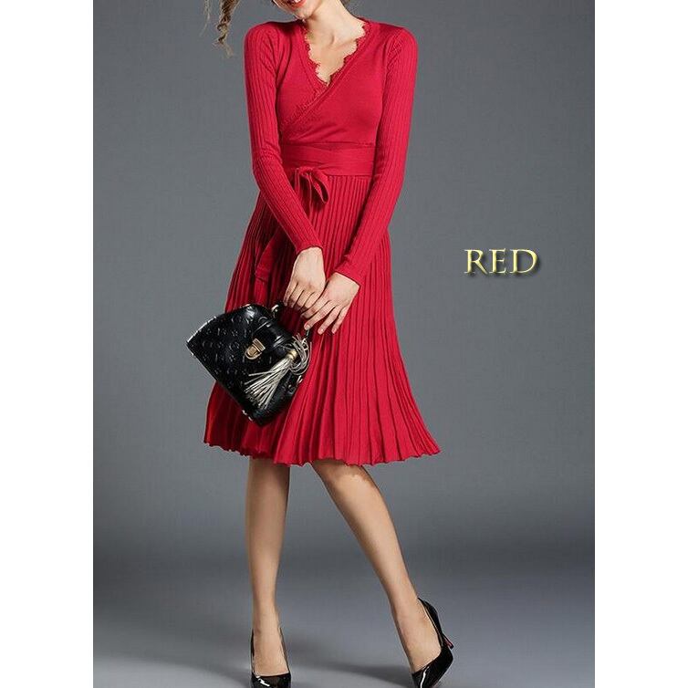 ☆SALE☆ ★前合わせレーストリム♪リボンベルト細プリーツワンピ全5色★