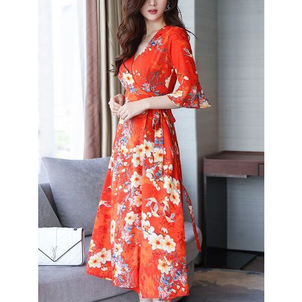 ☆SALE☆ ★和モダンフローラル柄♪Vネックロングワンピース全3種★