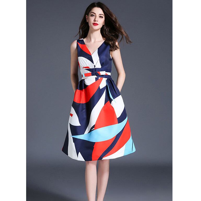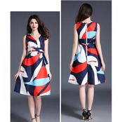 ☆SALE☆ ★幾何学的カラーブロック柄♪カシュクールネックドレス全2色★