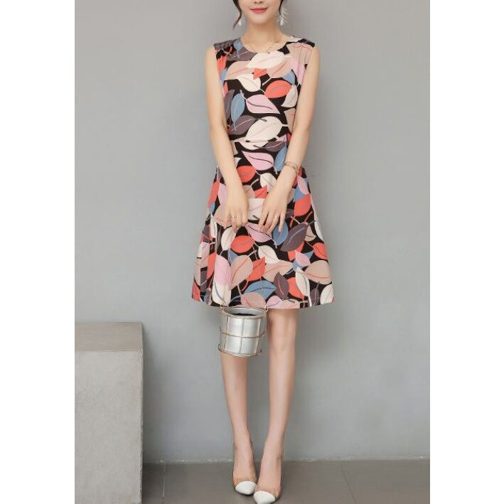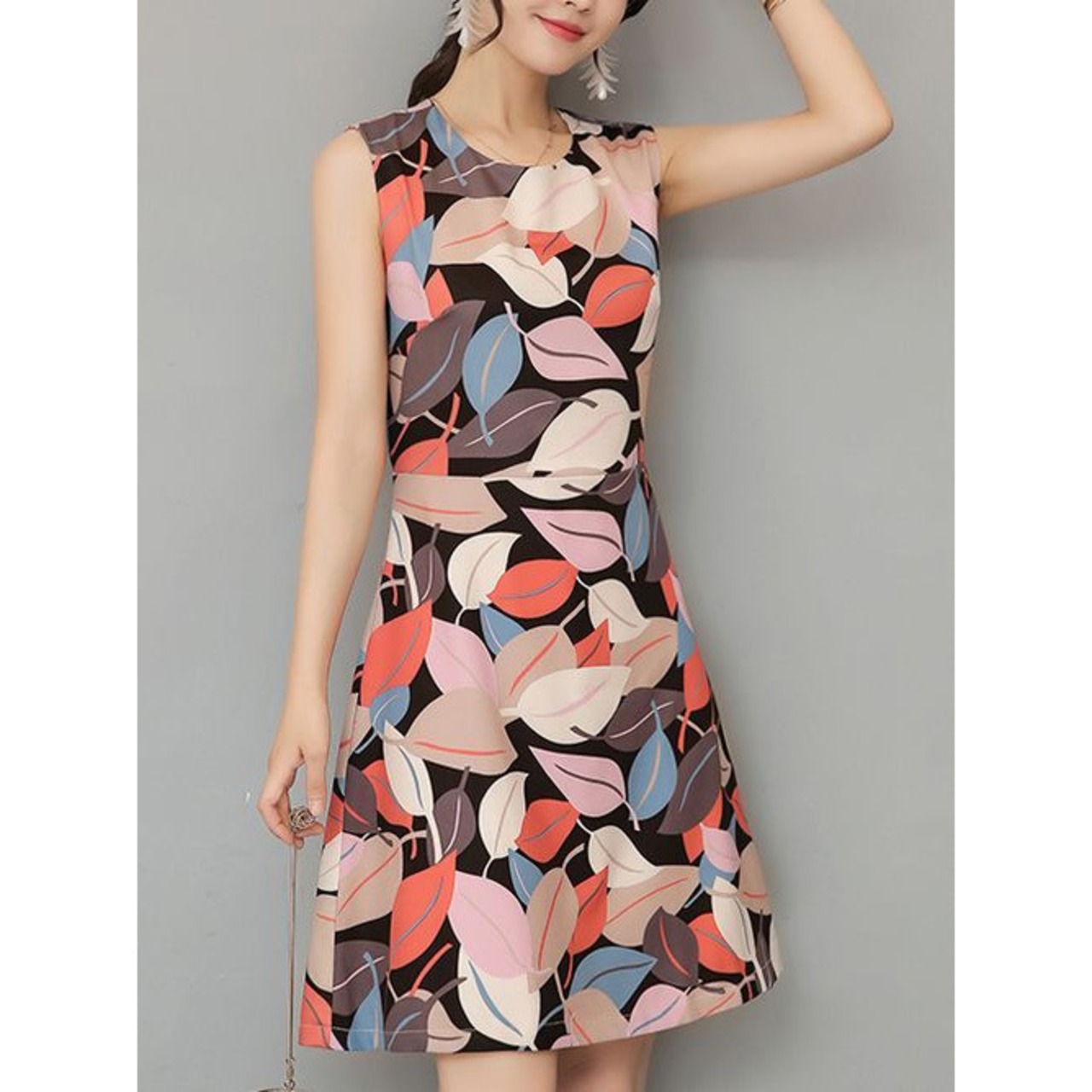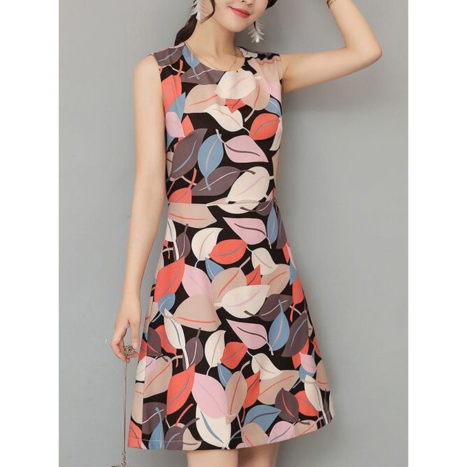 ☆SALE☆ ★彩りカラフルリーフ柄♪Aラインノースリワンピース★