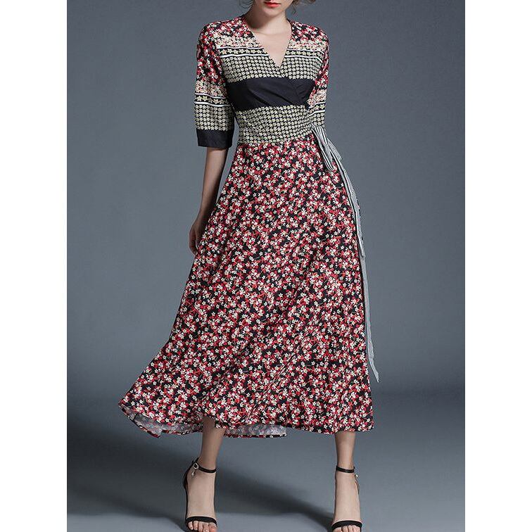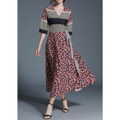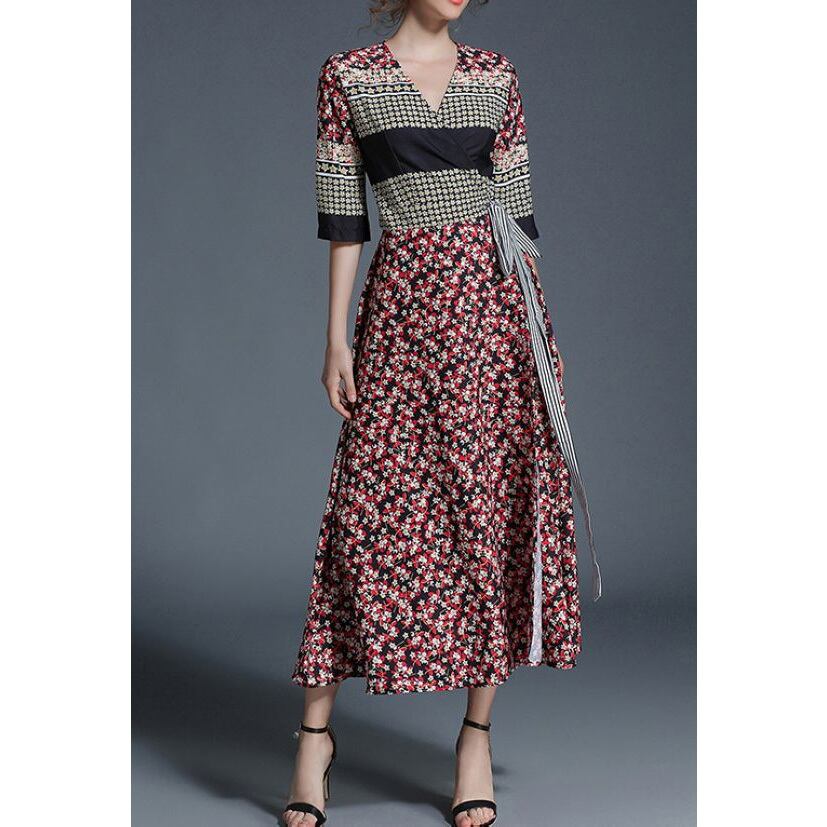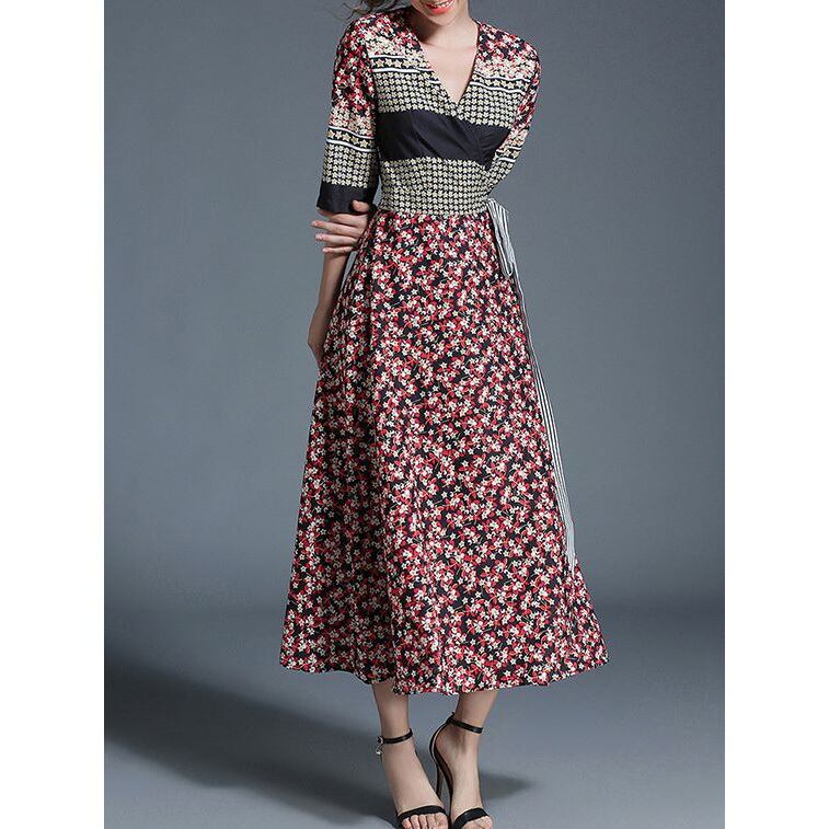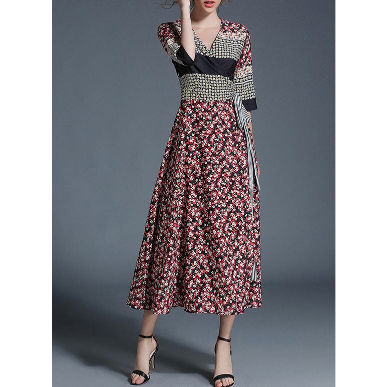 ☆SALE☆ ★星柄×小花×ストライプリボン♪Vネック個性派ロングワンピ★