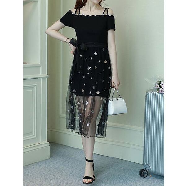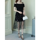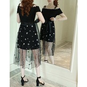 ☆SALE☆ ★星&フラワー柄透けレイヤード♪オフショル風肩見せワンピ★