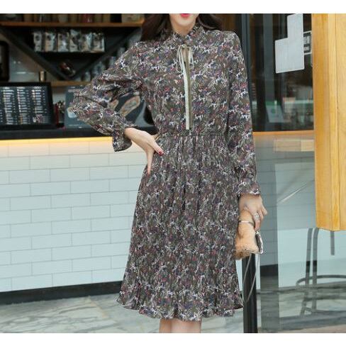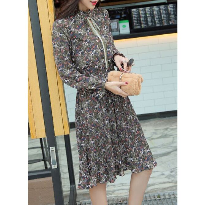 ☆SALE☆ ★細リボンタイ&極細プリーツ♪フローラル柄ワンピース全2色★