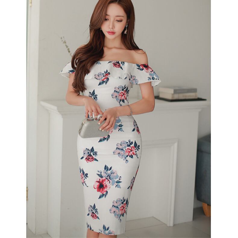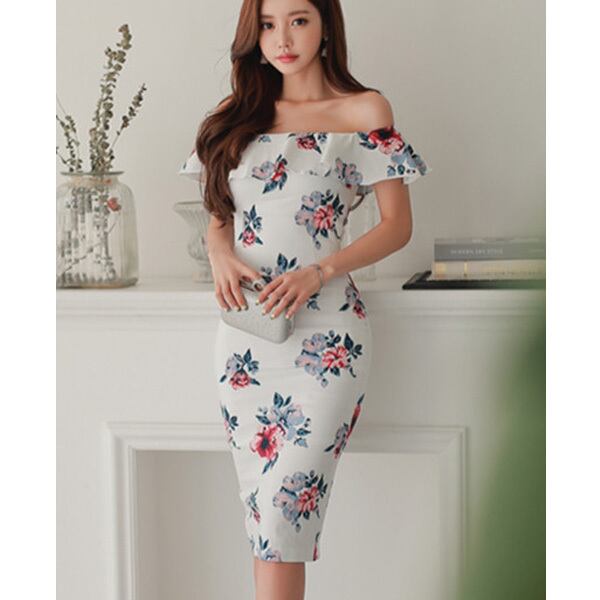 ☆SALE☆ ★花柄×フリルで華やか可愛い♪オフショルタイトドレス★