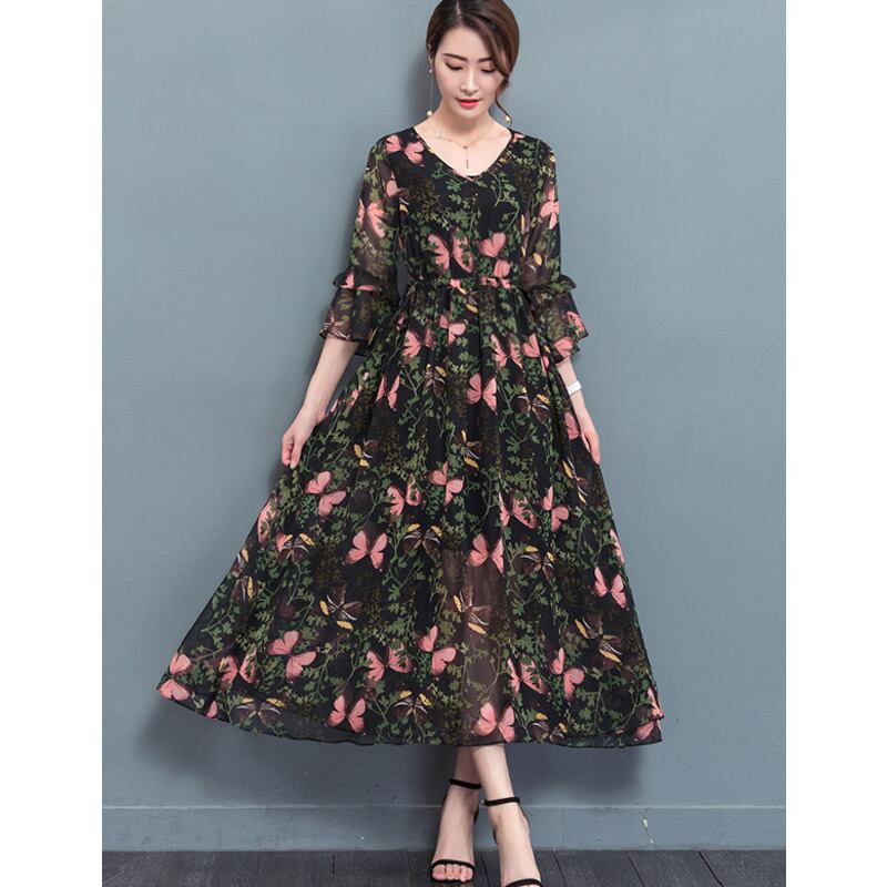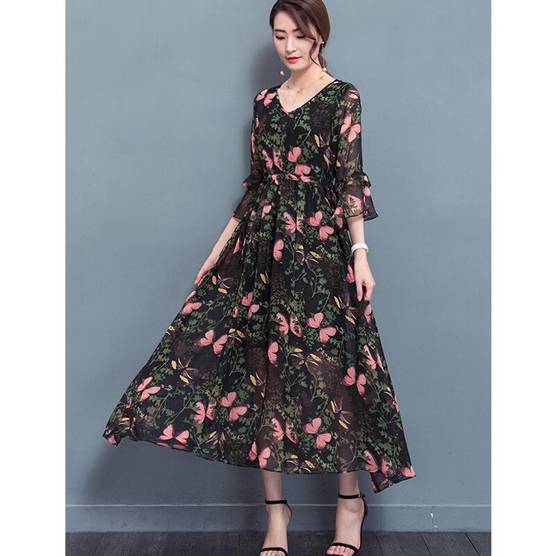 ☆SALE☆ ★蝶々&ボタニカル柄♪フレアー袖セミシアーシフォンワンピ★