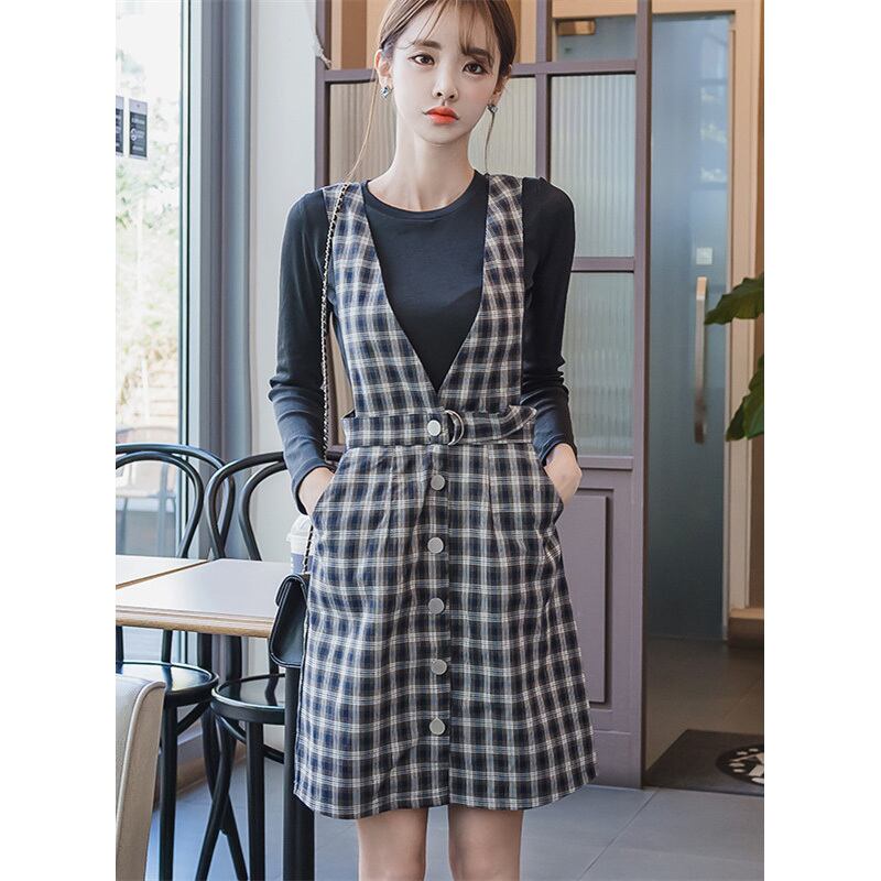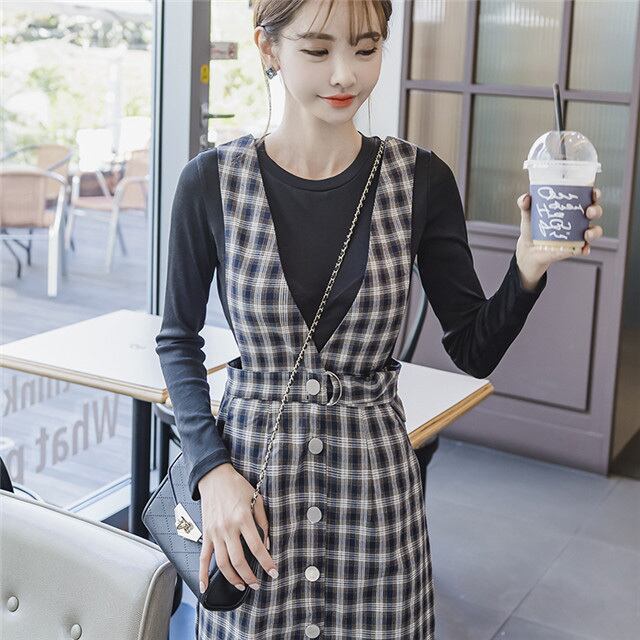 ☆SALE☆ ★黒ロンT付き♪深Vネックチェック柄ワンピース2点セット★
