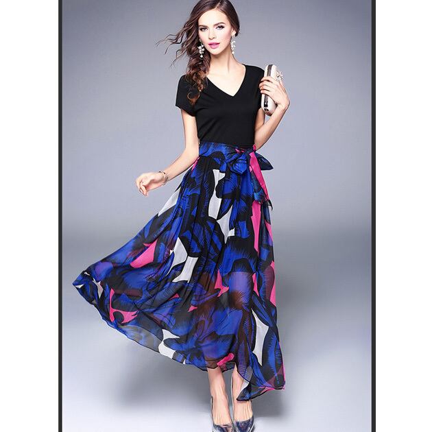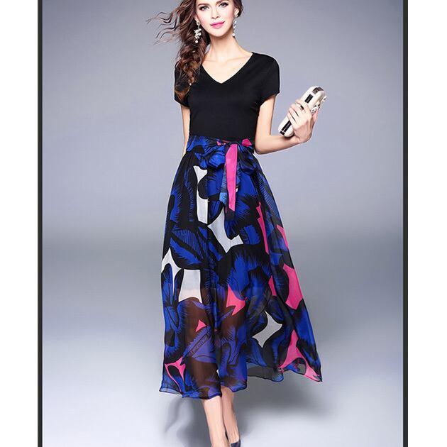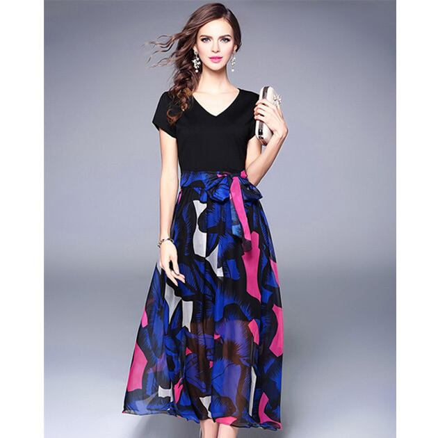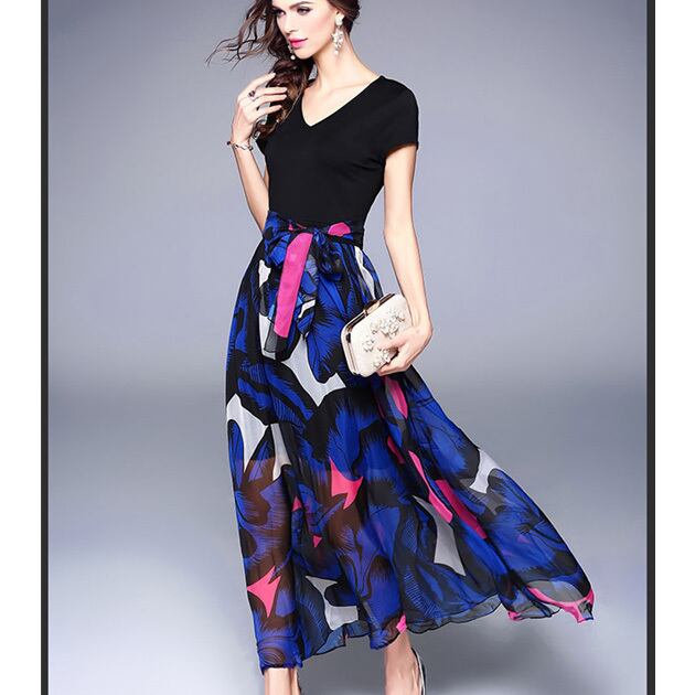 ☆SALE☆ ★Vネック黒トップ♪透けシフォンロングフレアーワンピース★
