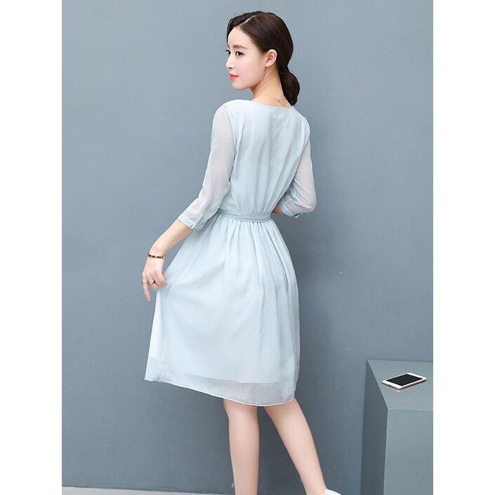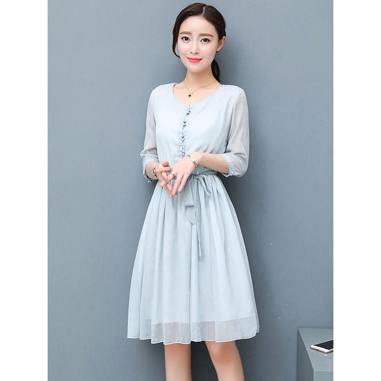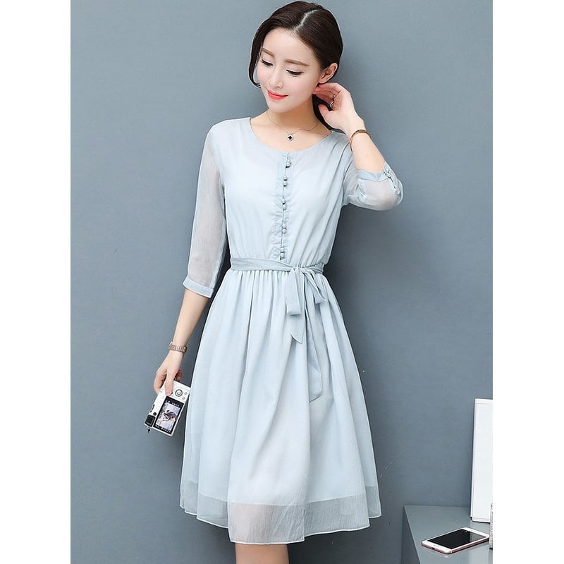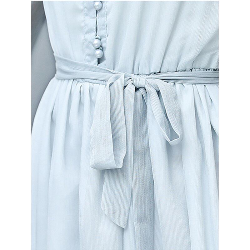 ☆SALE☆ ★Wボタントリム&ウエストリボン♪七分袖シフォンワンピース★