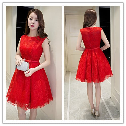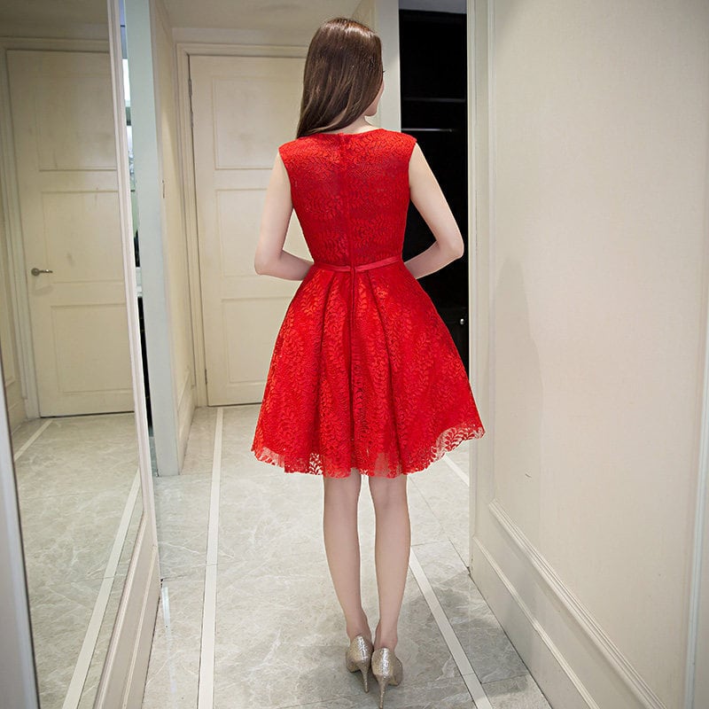 ☆SALE☆ ウエストマークのパーティードレス 赤 レース チュール 膝丈