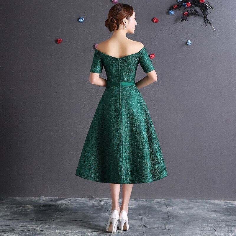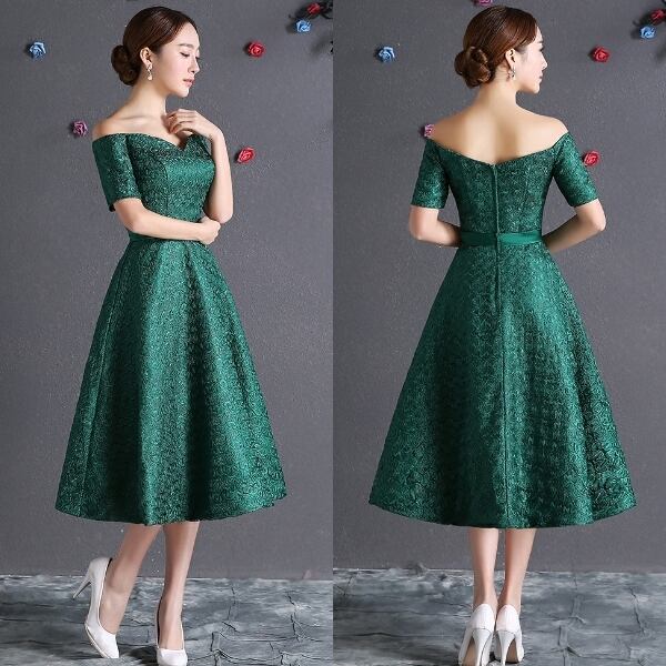 ☆SALE☆ オフショルダー 大人っぽい深緑のフレアパーティードレス