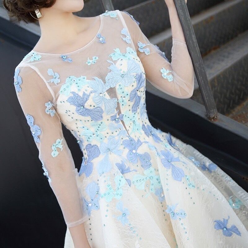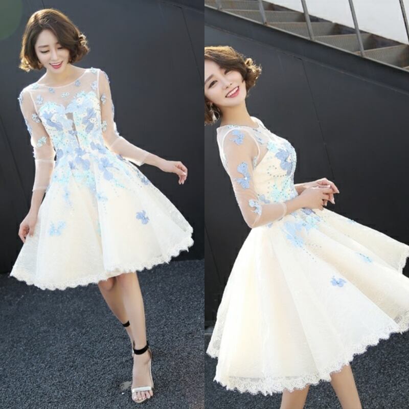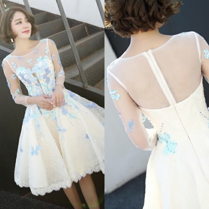 ☆SALE☆ シャンパン シースルー長袖パーティードレス 膝丈 結婚式二次会