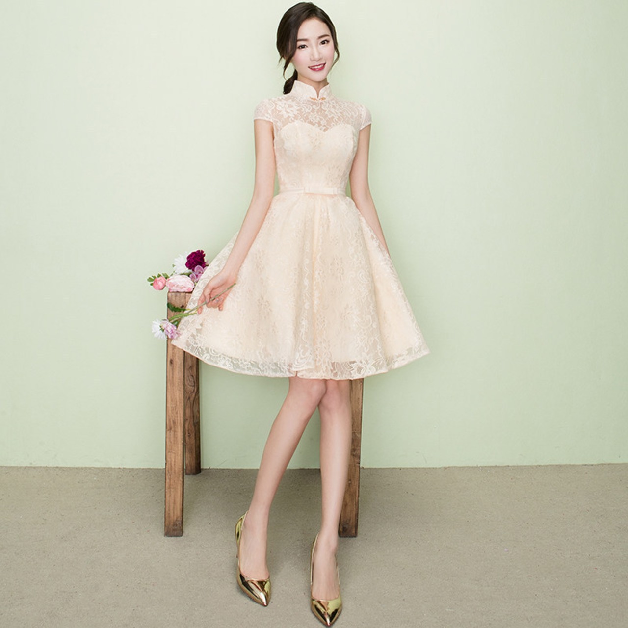 ☆SALE☆ シャンパン 透けレースパーティードレス 半袖 膝丈 結婚式