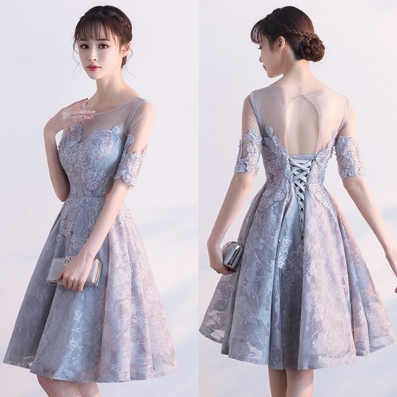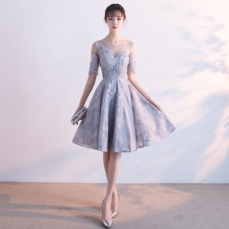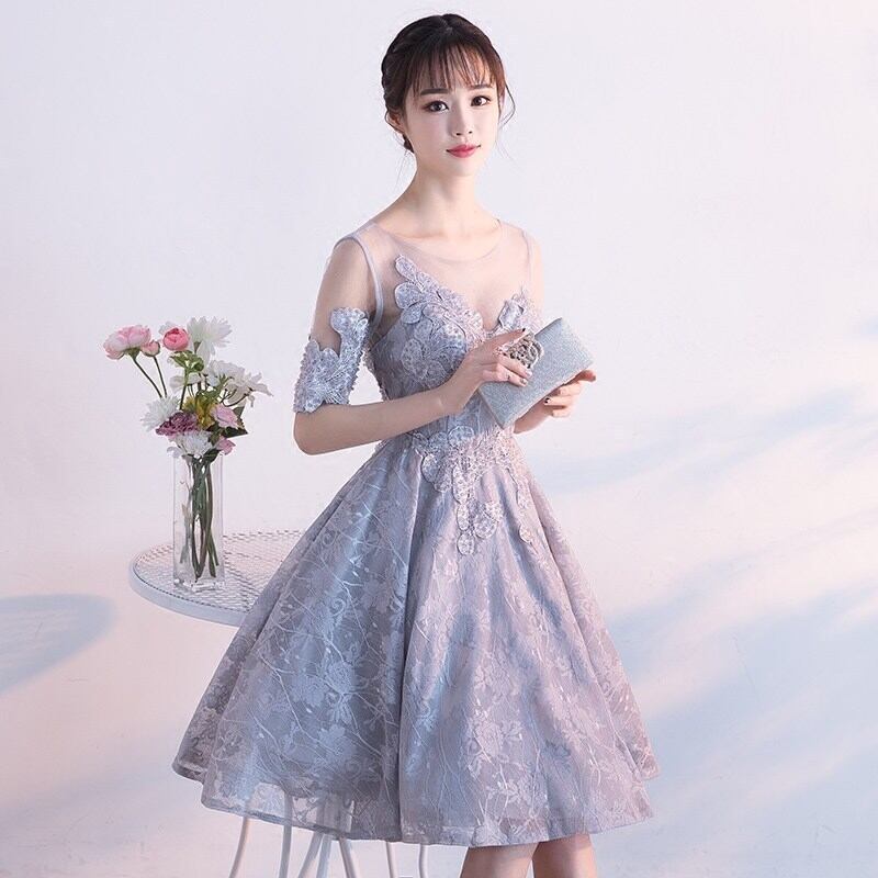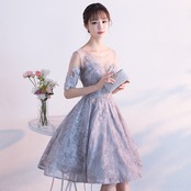 ☆SALE☆ シルバーグレーフレアパーティードレス 膝丈 ミニ 半袖 結婚式