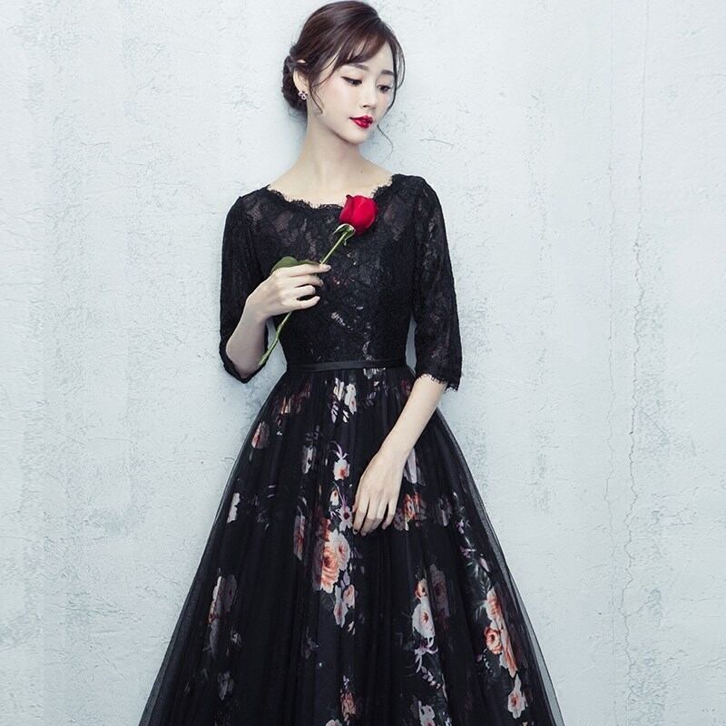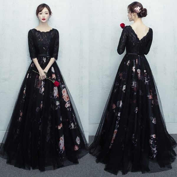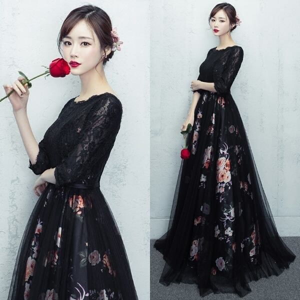 ☆SALE☆ 七分袖 ロングパーティードレス 黒ブラック 結婚式 発表会 式典