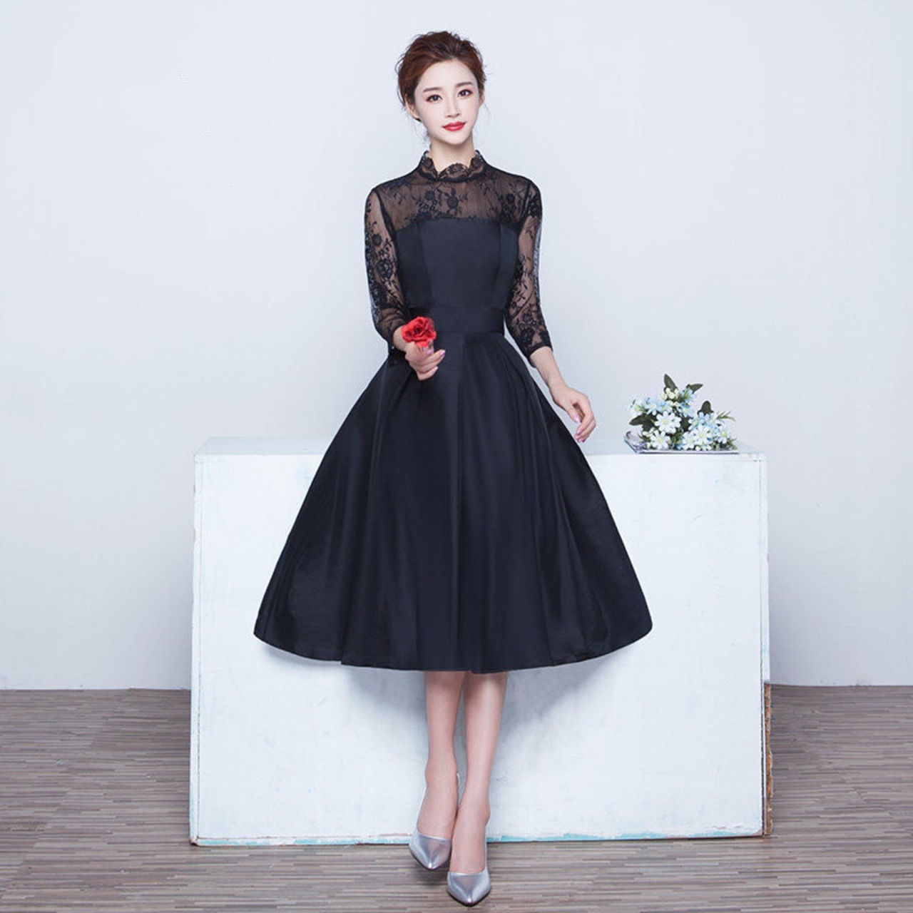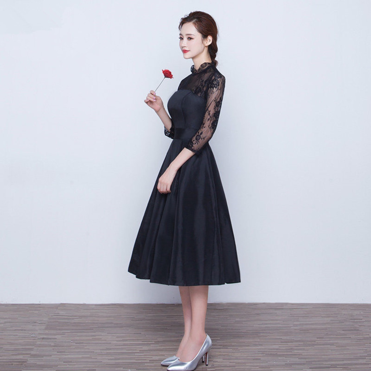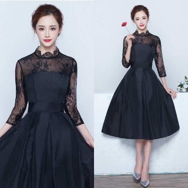☆SALE☆ 七分袖 大人っぽい 黒パーティードレス 膝丈 結婚式 二次会