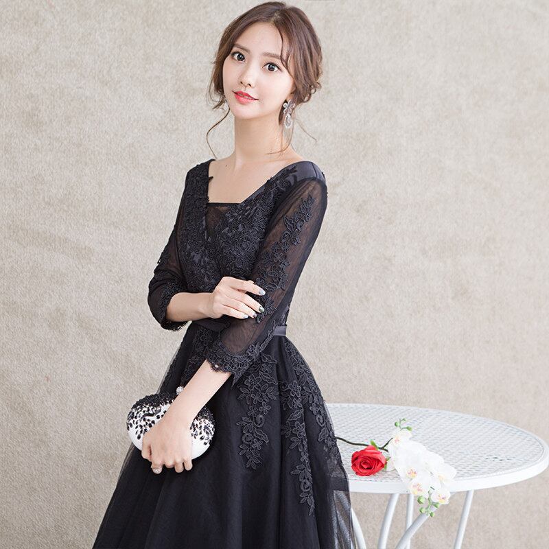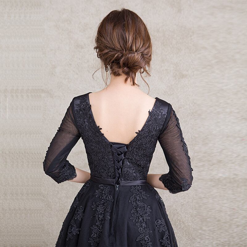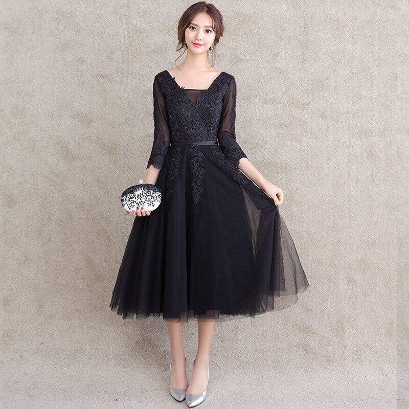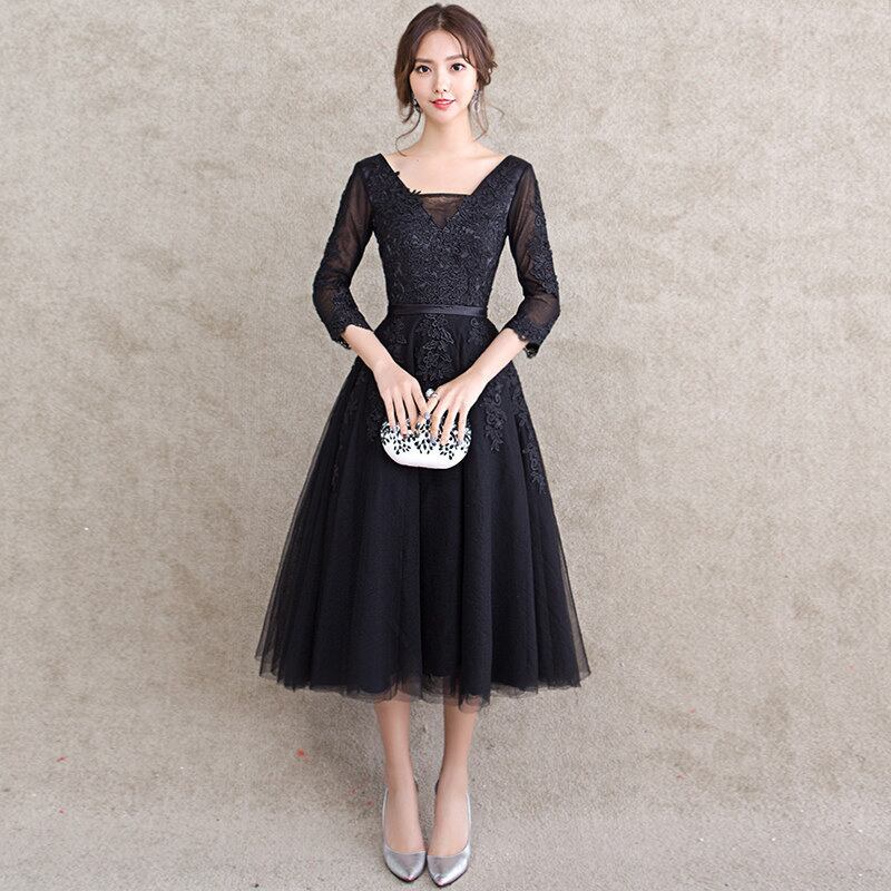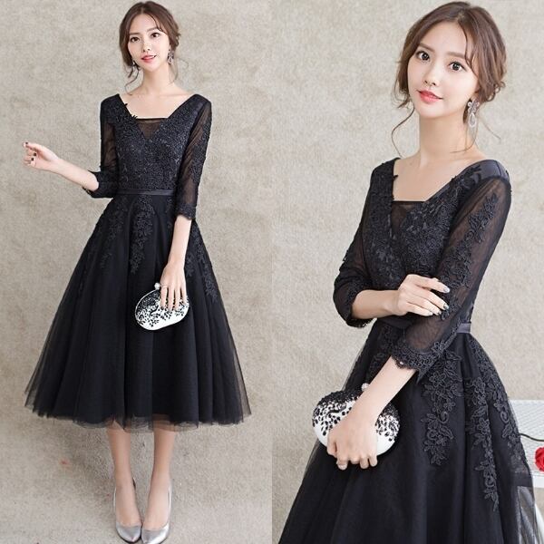☆SALE☆ 七分袖 黒 パーティードレス ミドル 結婚式 演奏会 衣装 発表会