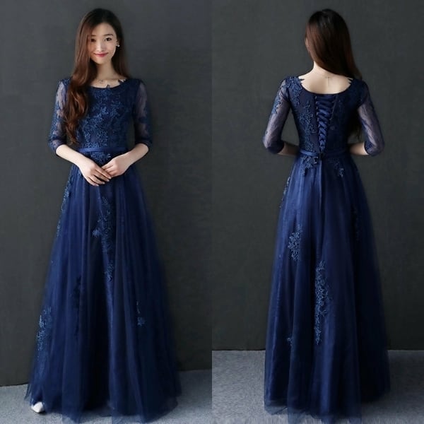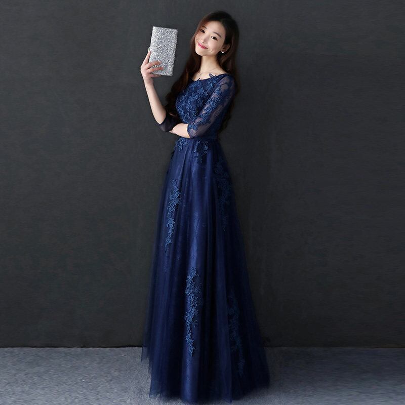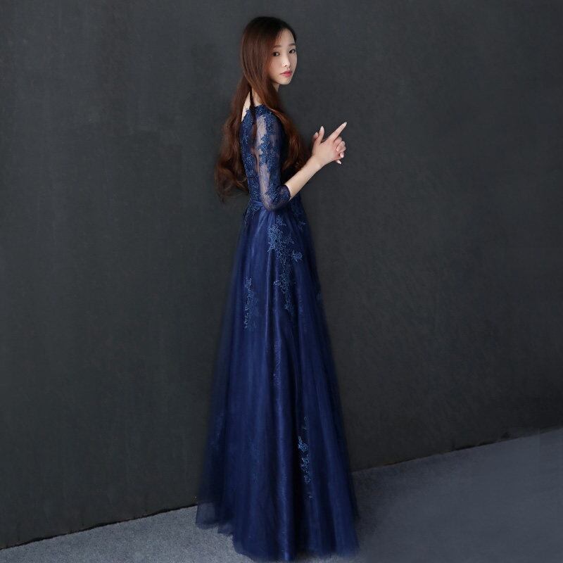 ☆SALE☆ 七分袖ネイビーロングパーティードレス 紺 結婚式 発表会 演奏会