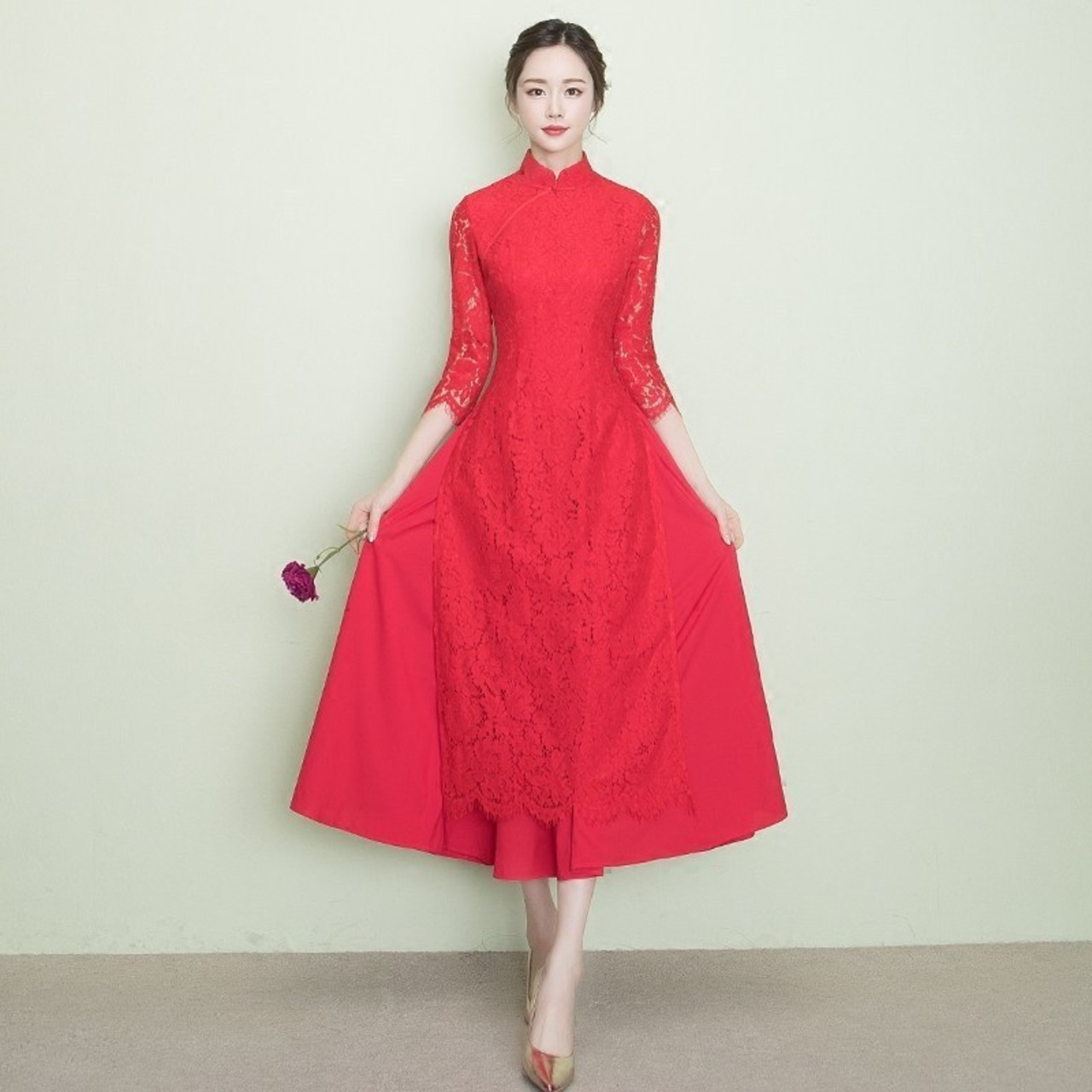 ☆SALE☆ 七分袖赤レースパーティードレス ミドル ロング 結婚式 二次会