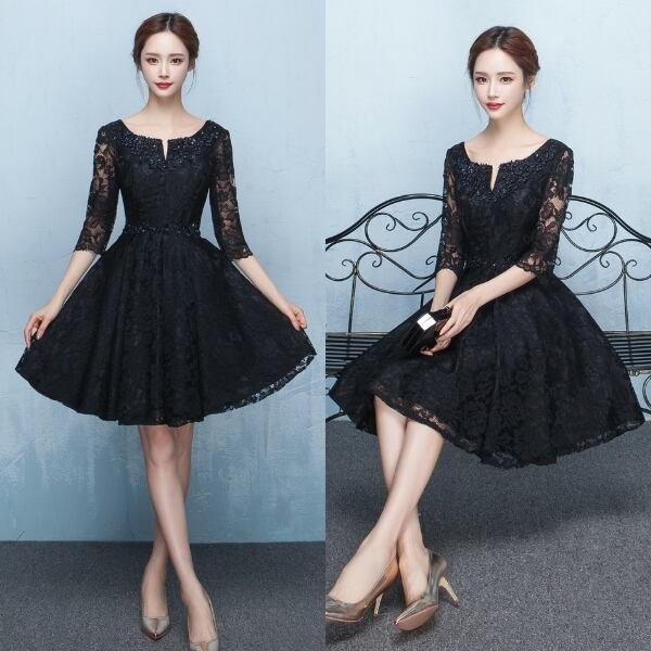 ☆SALE☆ 五分袖フレアパーティードレス 膝丈 レース 結婚式演奏会式典