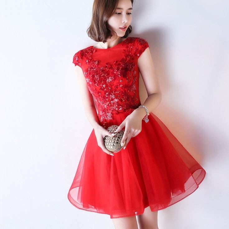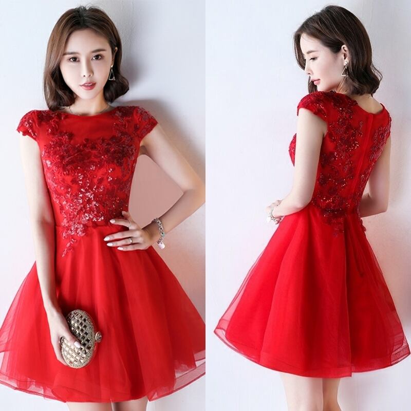 ☆SALE☆ 半袖 赤パーティードレス 結婚式 二次会 キャバ 演奏会 発表会
