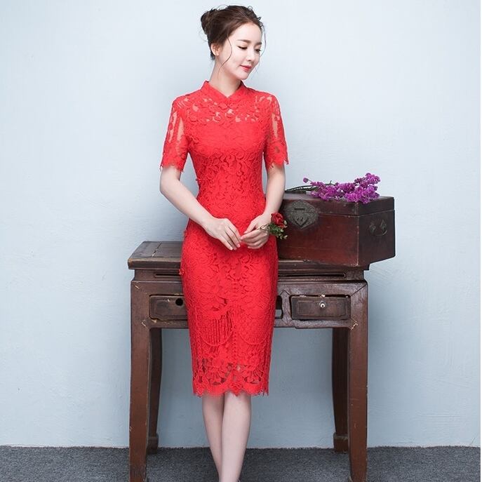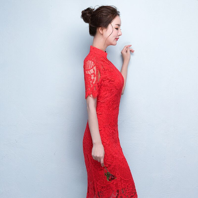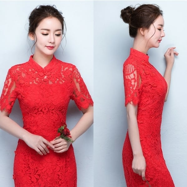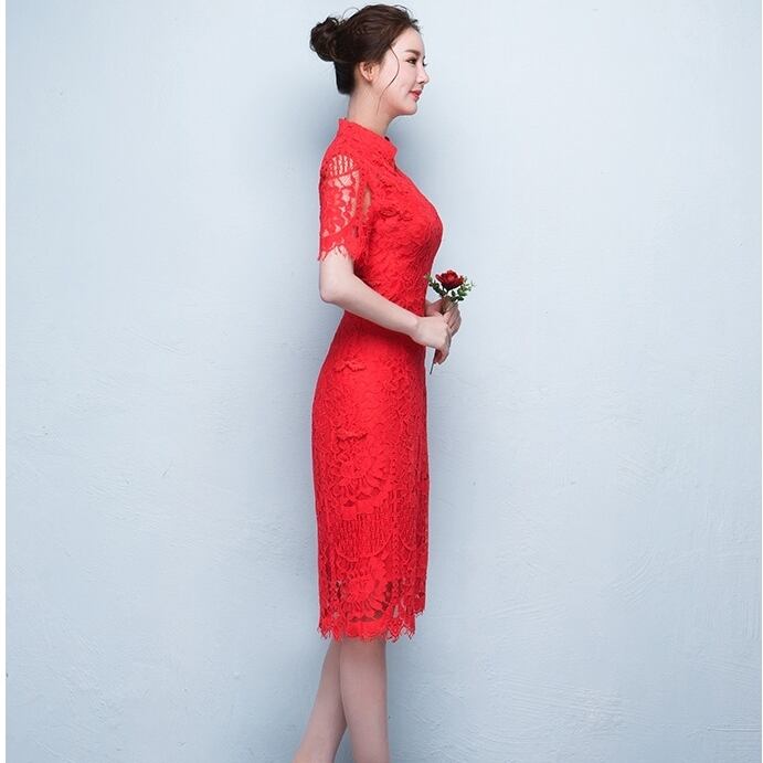 ☆SALE☆ 半袖 赤レース タイトパーティードレス ミドル丈 結婚式 衣装