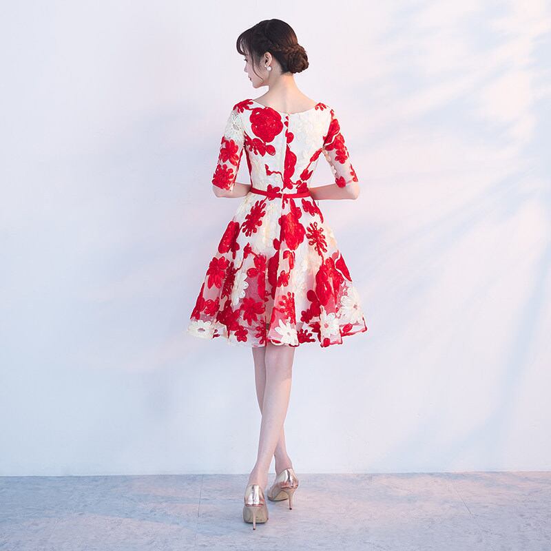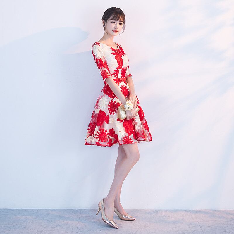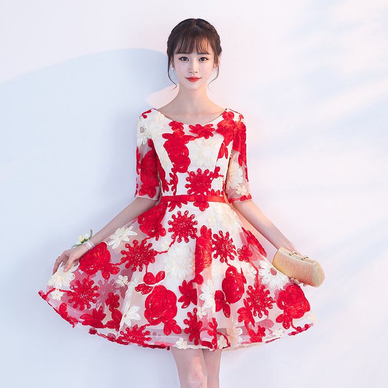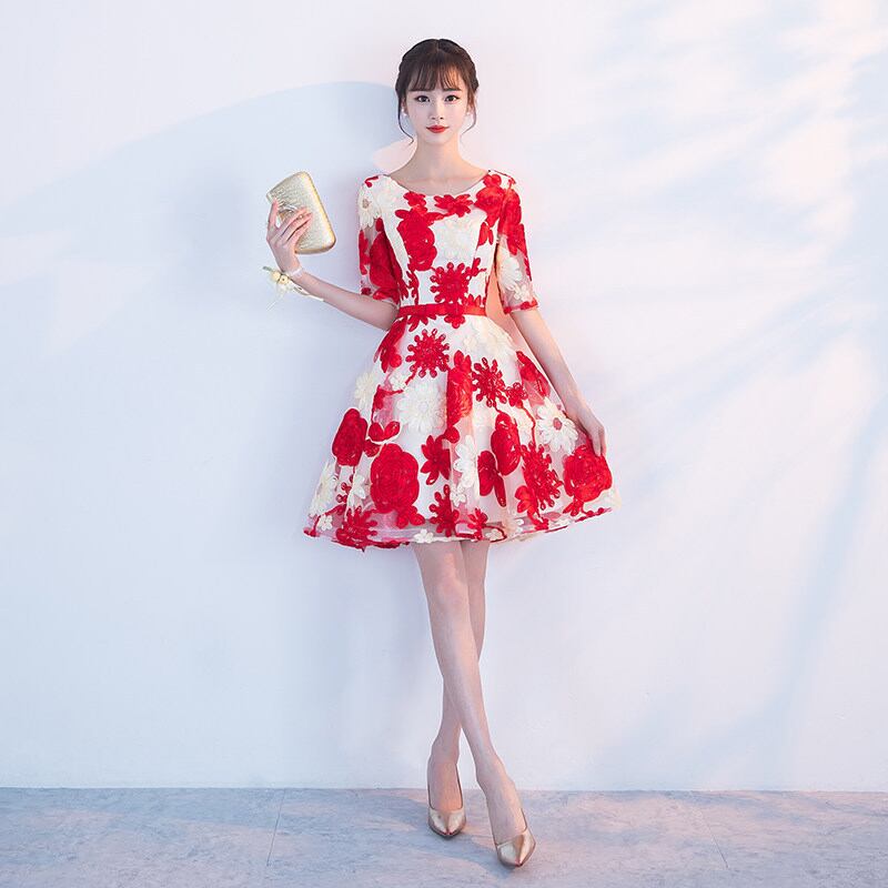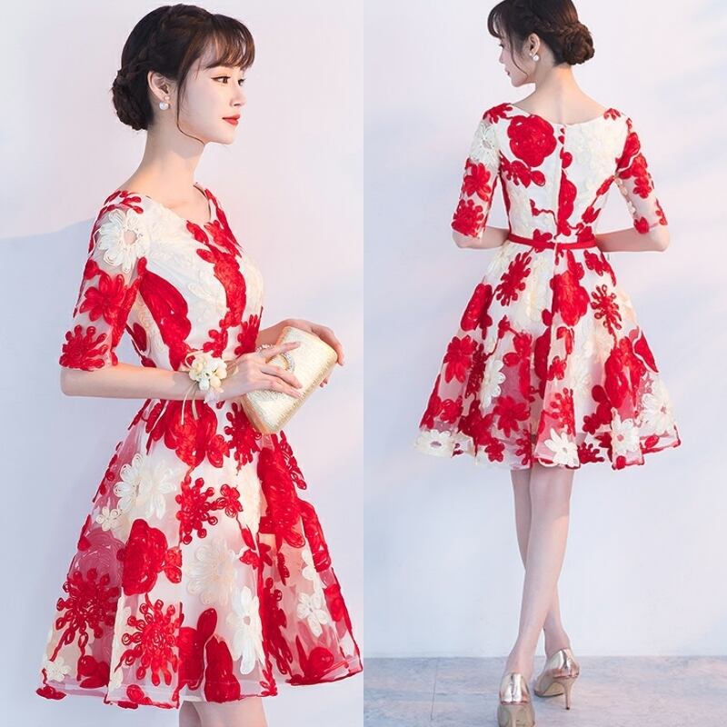 ☆SALE☆ 半袖 赤総柄パーティードレス 膝丈 ミニ 結婚式 二次会 発表会