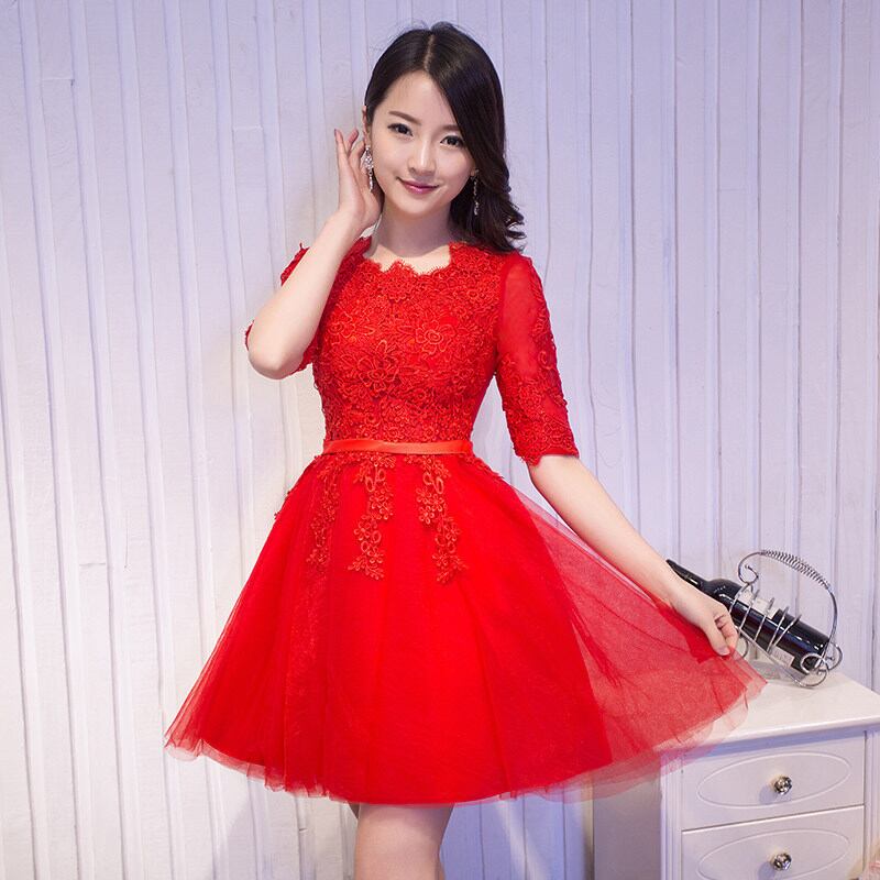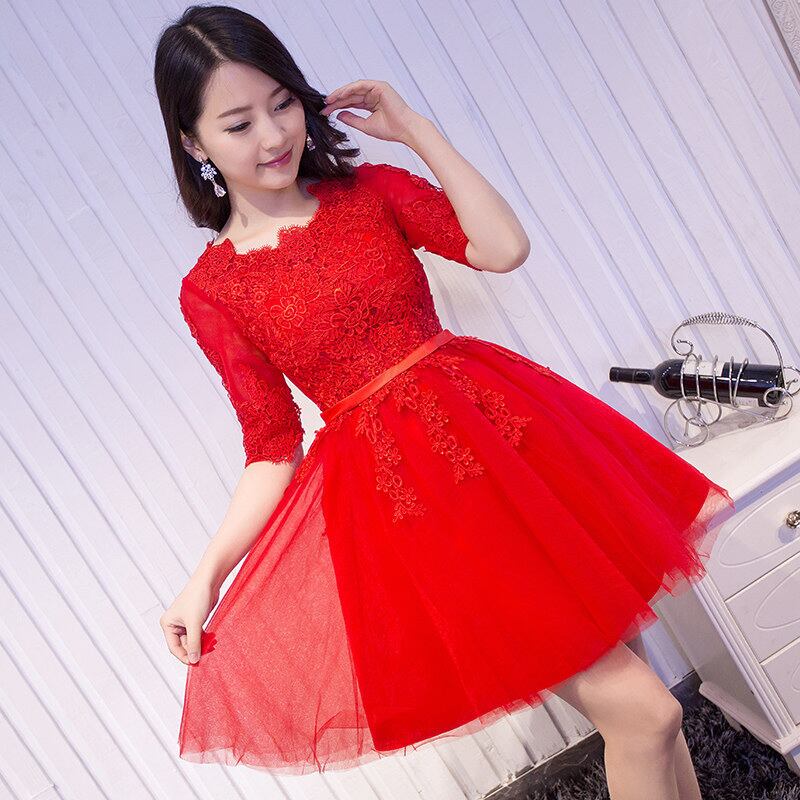 ☆SALE☆ 可愛い 目立つ フレアパーティードレス 赤 五分袖 ミニ 膝丈