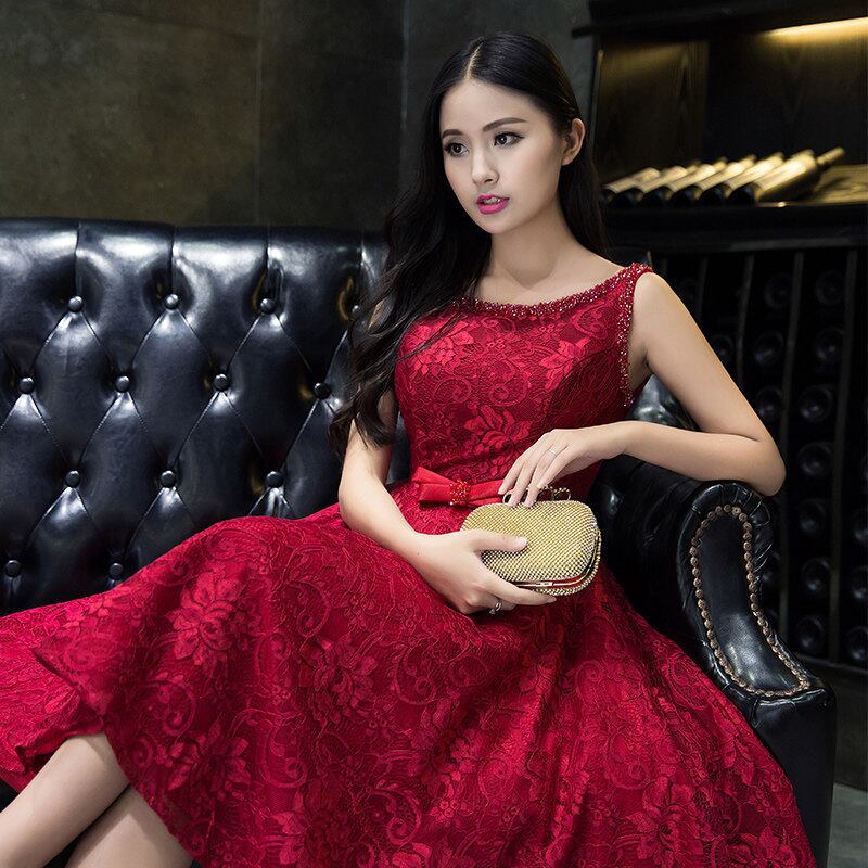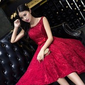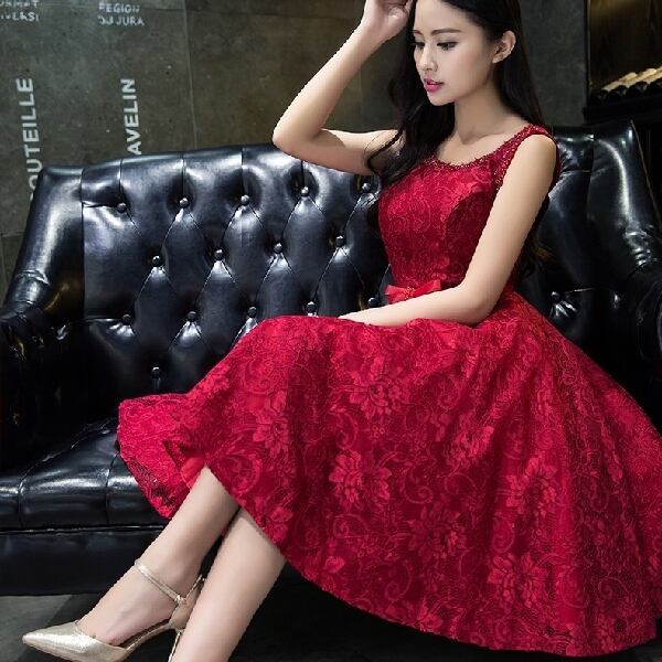 ☆SALE☆ 深紅のレースパーティードレス ノースリーブ フレアギャザー