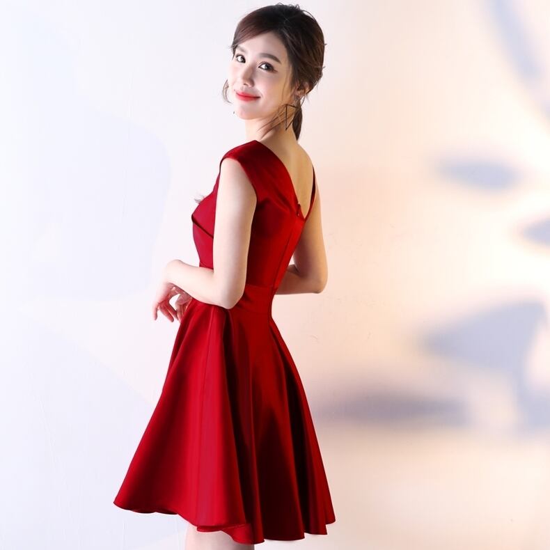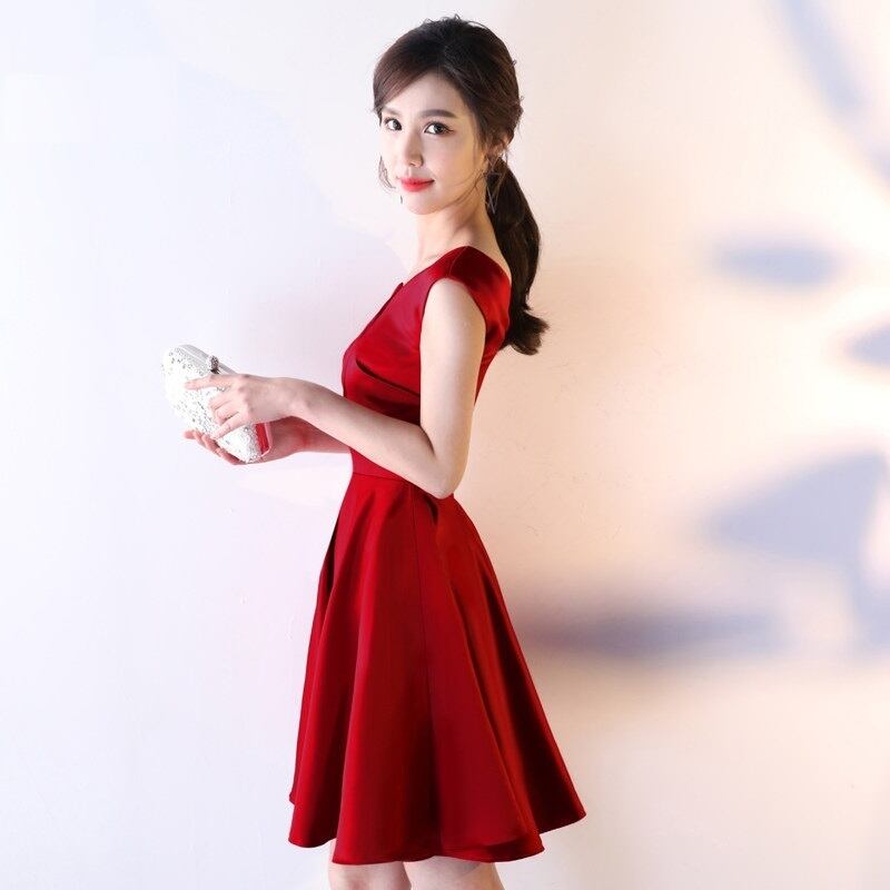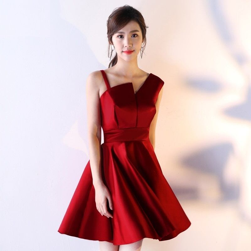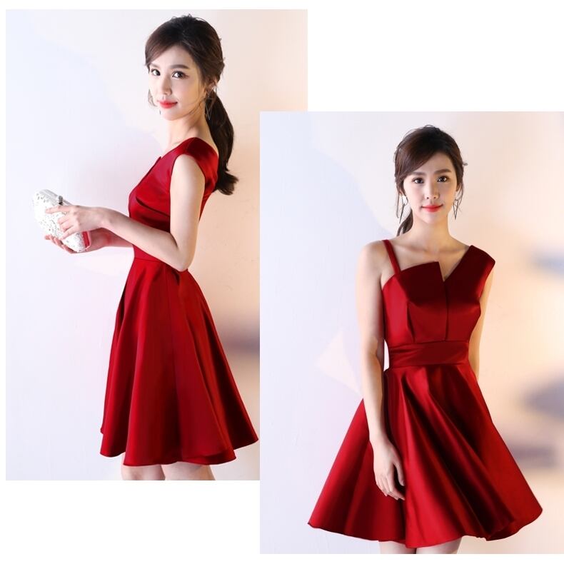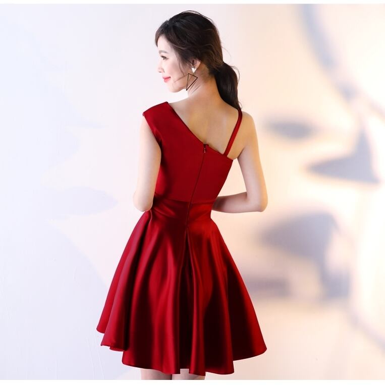 ☆SALE☆ 立体カットデザイン ワンショルダー風赤パーティードレス 膝丈