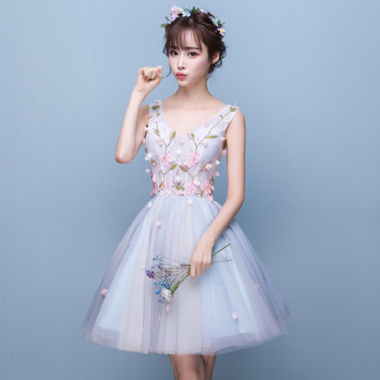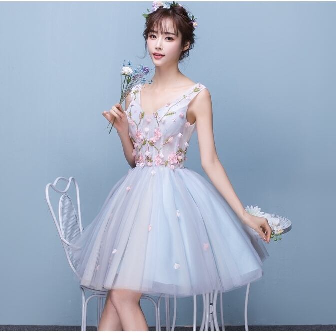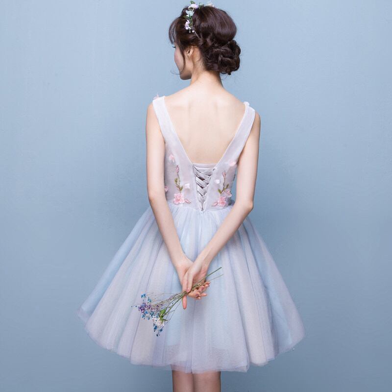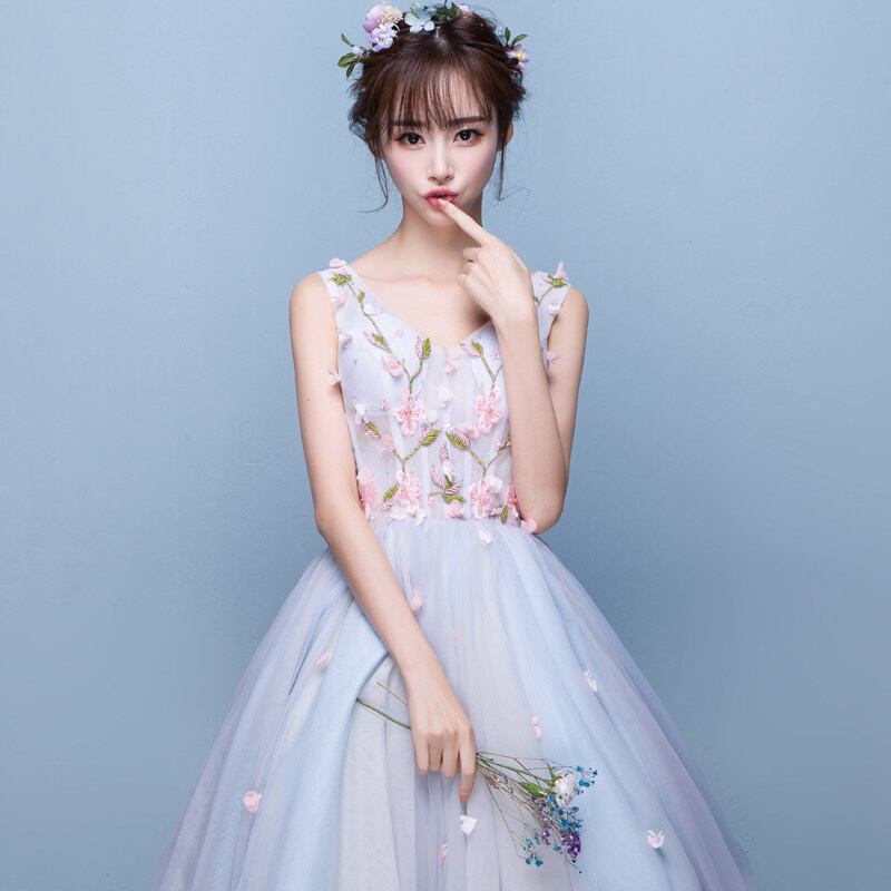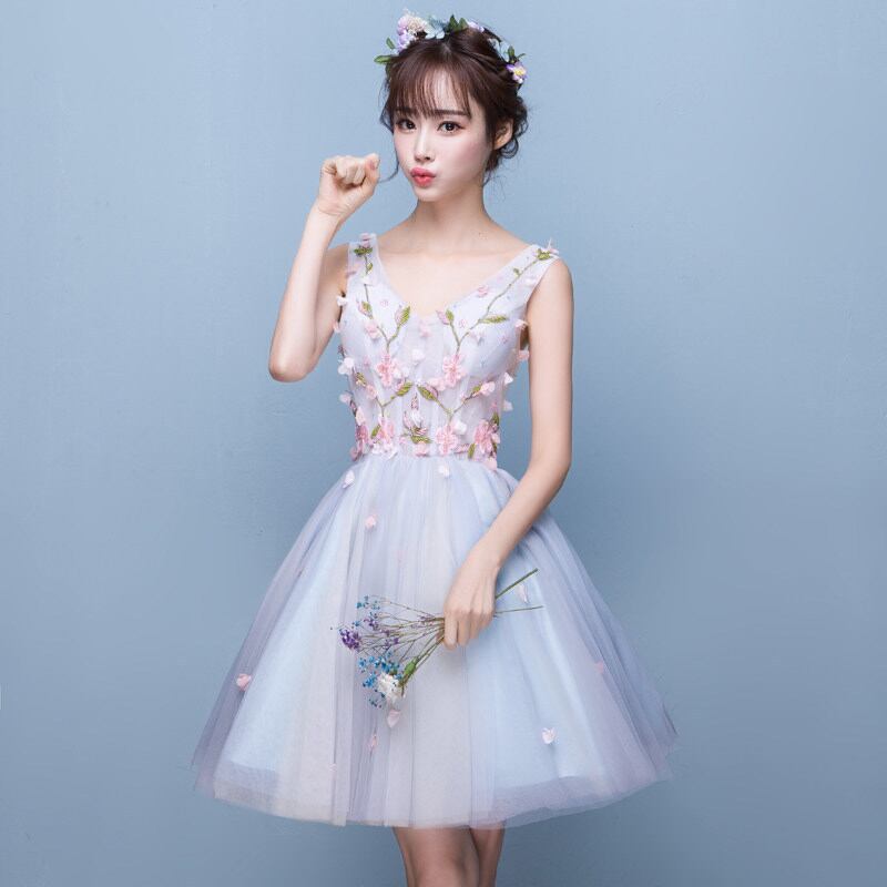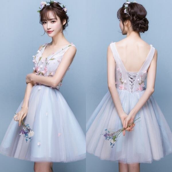 ☆SALE☆ 花刺繍フレアパーティードレス 膝丈 ノースリーブ 結婚式 二次会