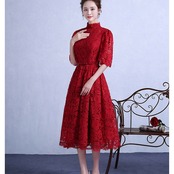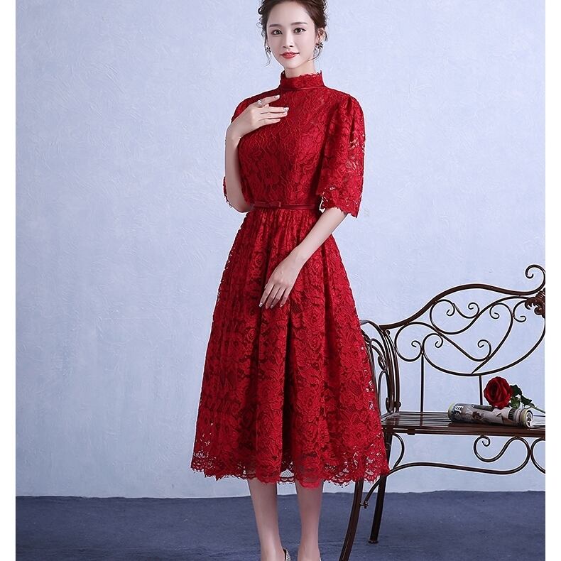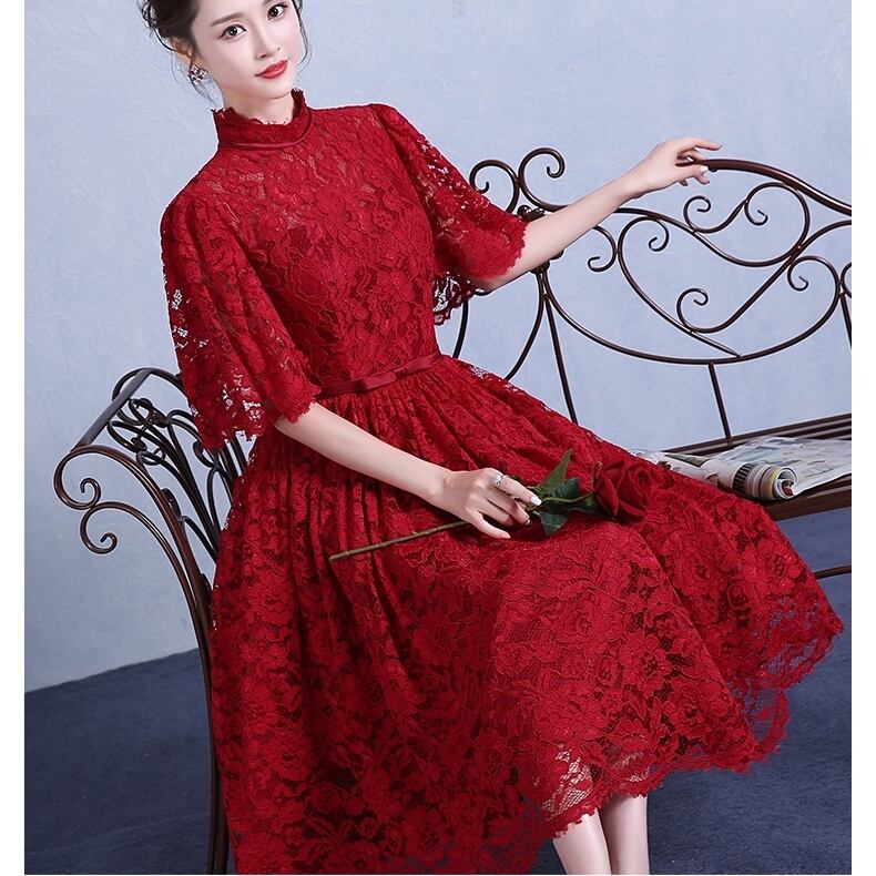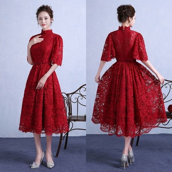 ☆SALE☆ 赤半袖フレアパーティードレス レース 膝丈 結婚式 二次会 発表